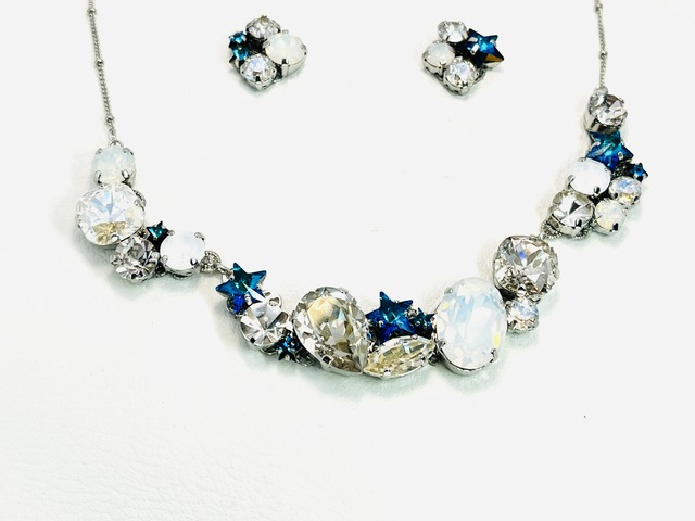 ネックレスとピアス/イヤリングのセットとなります。 ネックレスの長さは約38cm+アジャスター約6cmです。 イヤリング/ピアスをお選びいただけます。 耳飾りご希望からお選びください。 【ファルベ】 ドイツ語で色調、色彩、音色などの意味を持つ単語から命名しました。名前の通り、色彩を楽しんでいただくアクセサリーセットです。 ヴィンテージに見られるクラスタータイプのアクセサリーをイメージして現代のお洋服にも合わせられるように意識しつつ、カラーテーマに沿ってグラスストーンを配置しています。 貴和クリスタル(ヨーロッパ産高級クリスタルガラスストーン)ほか、国内では余り見られないカラーストーン、一部ヴィンテージストーンや天然石などを使用しております。 ※一つずつ丁寧に作るよう心がけておりますが、繊細な作りとなっていますので、強い負荷などはかけないようにご注意ください。 ※できるだけ実物に近づけるように努力していますが、実物と写真の色味がちがって見える場合があるかと思います。気になる場合、購入前にお問い合わせいただければ幸いです。 ※一点物のつもりでは作っていないので、今後同じもの・似たものが出る可能性ありますので、その点ご了承いただきますようお願いします。 ※カラーオーダーについてはこちらで対応しております。 https://torikago-rico.booth.pm/items/4080701
