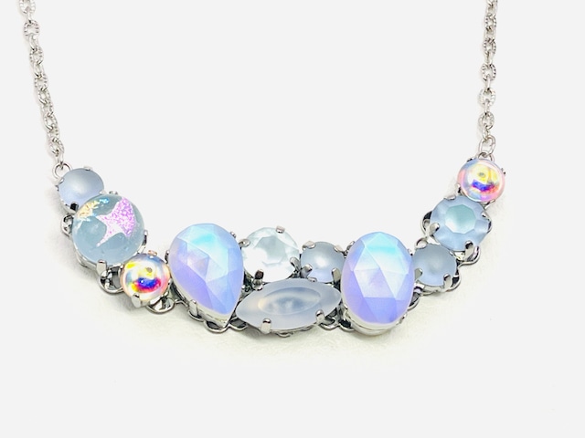 ネックレスのみの販売です。 長さは全長約42cm+アジャスター5cmです。 【プチファルベ】 ドイツ語で色調、色彩、音色などの意味を持つ単語から命名しました。名前の通り、色彩を楽しんでいただくアクセサリーセットです。 ヴィンテージに見られるクラスタータイプのアクセサリーをイメージして現代のお洋服にも合わせられるように意識しつつ、カラーテーマに沿ってグラスストーンを配置しています。 貴和クリスタル(ヨーロッパ産高級クリスタルガラスストーン)ほか、国内では余り見られないカラーストーン、一部ヴィンテージストーンや天然石などを使用しております。 ファルベアクセサリーセットと、同タイトルの物は製作に同じカラーの石を使用しております。 ※一つずつ丁寧に作るよう心がけておりますが、繊細な作りとなっていますので、強い負荷などはかけないようにご注意ください。 ※できるだけ実物に近づけるように努力していますが、実物と写真の色味がちがって見える場合があるかと思います。気になる場合、購入前にお問い合わせいただければ幸いです。 ※一点物のつもりでは作っていないので、今後同じもの・似たものが出る可能性ありますので、その点ご了承いただきますようお願いします。