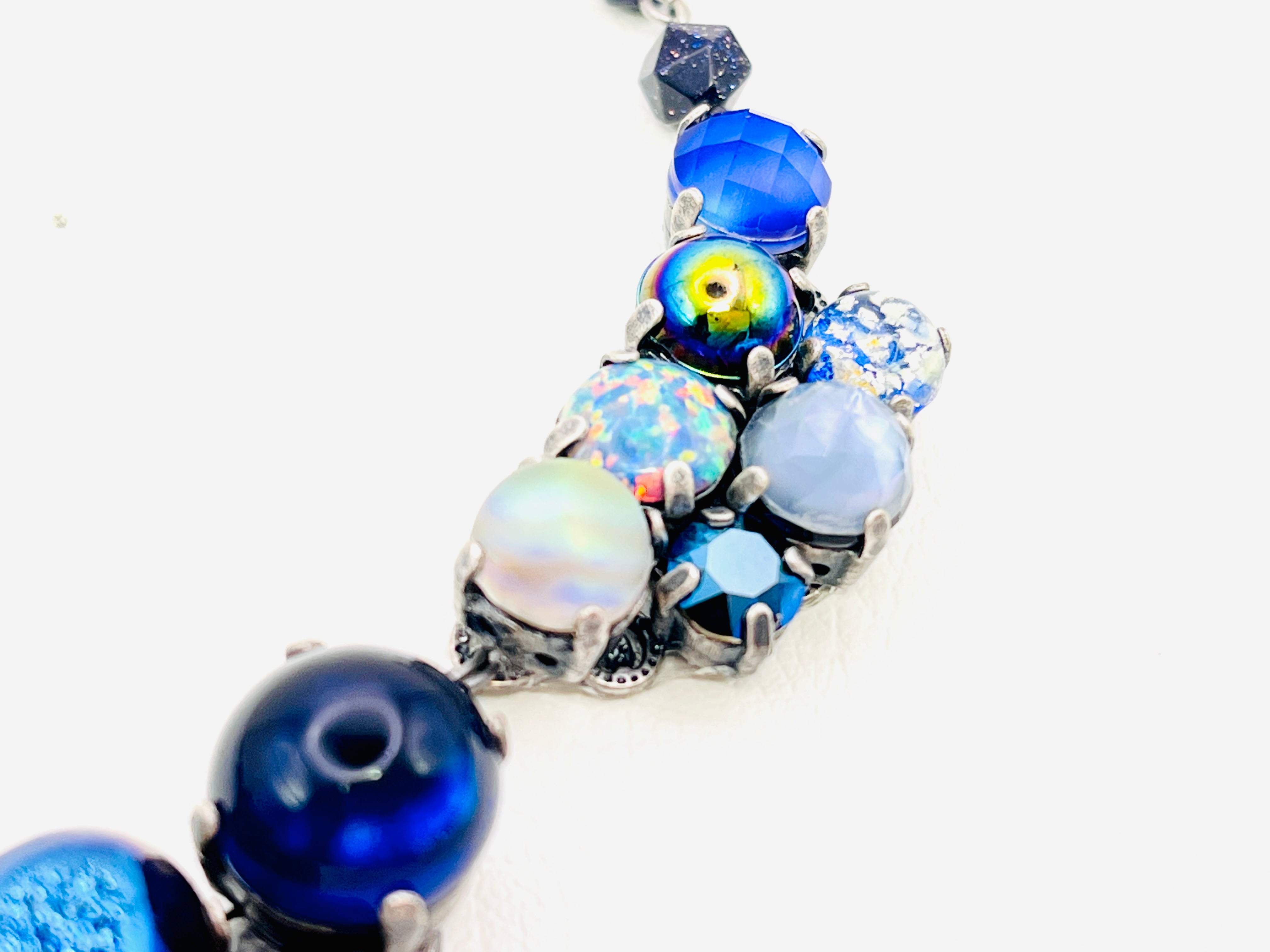 ヴィンテージに見られるクラスタータイプのアクセサリーをイメージして現代のお洋服にも合わせられるように意識しつつ、カラーテーマに沿ってグラスストーンを配置しています。