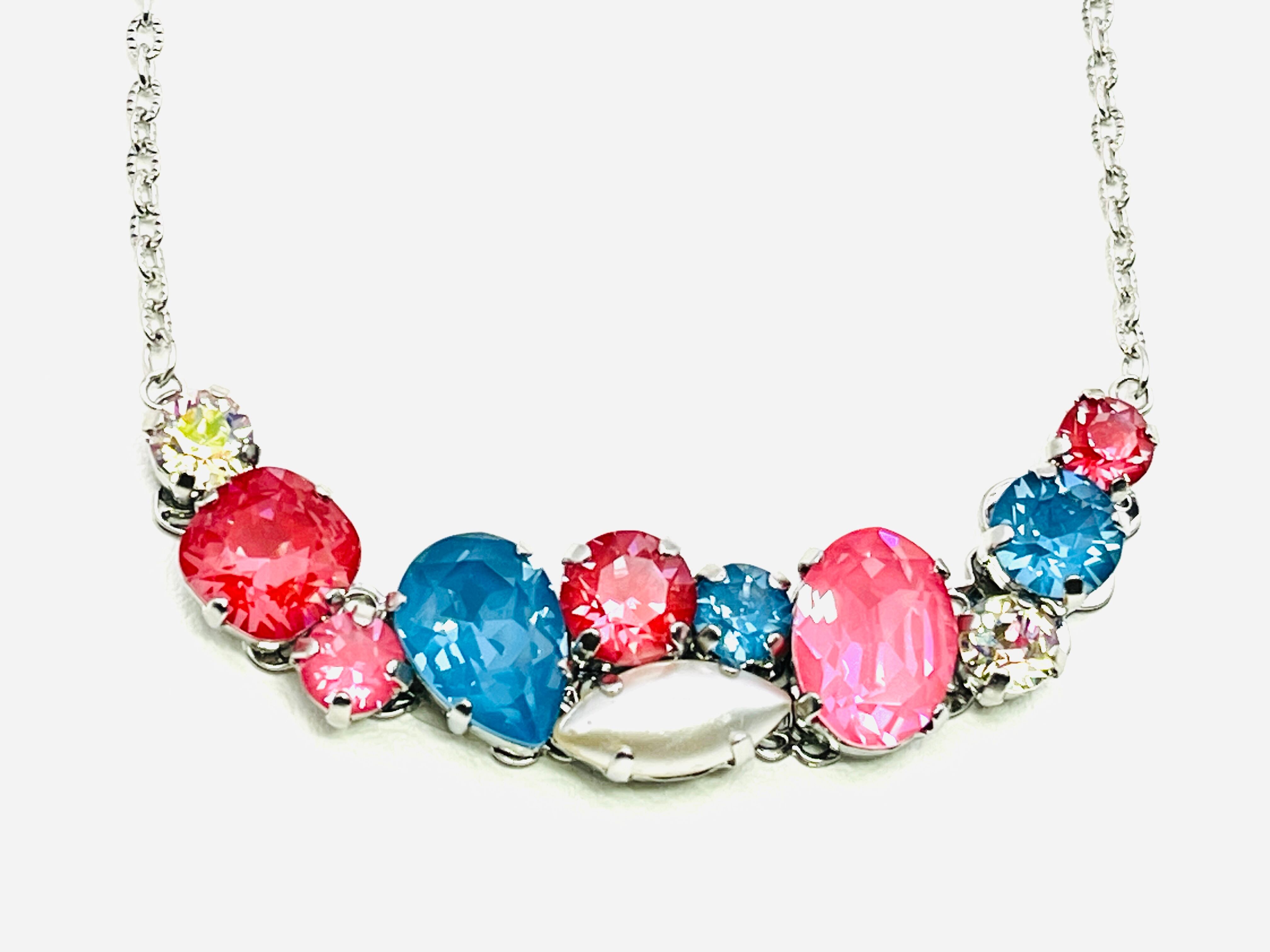 ヴィンテージに見られるクラスタータイプのアクセサリーをイメージして現代のお洋服にも合わせられるように意識しつつ、カラーテーマに沿ってグラスストーンを配置しています。