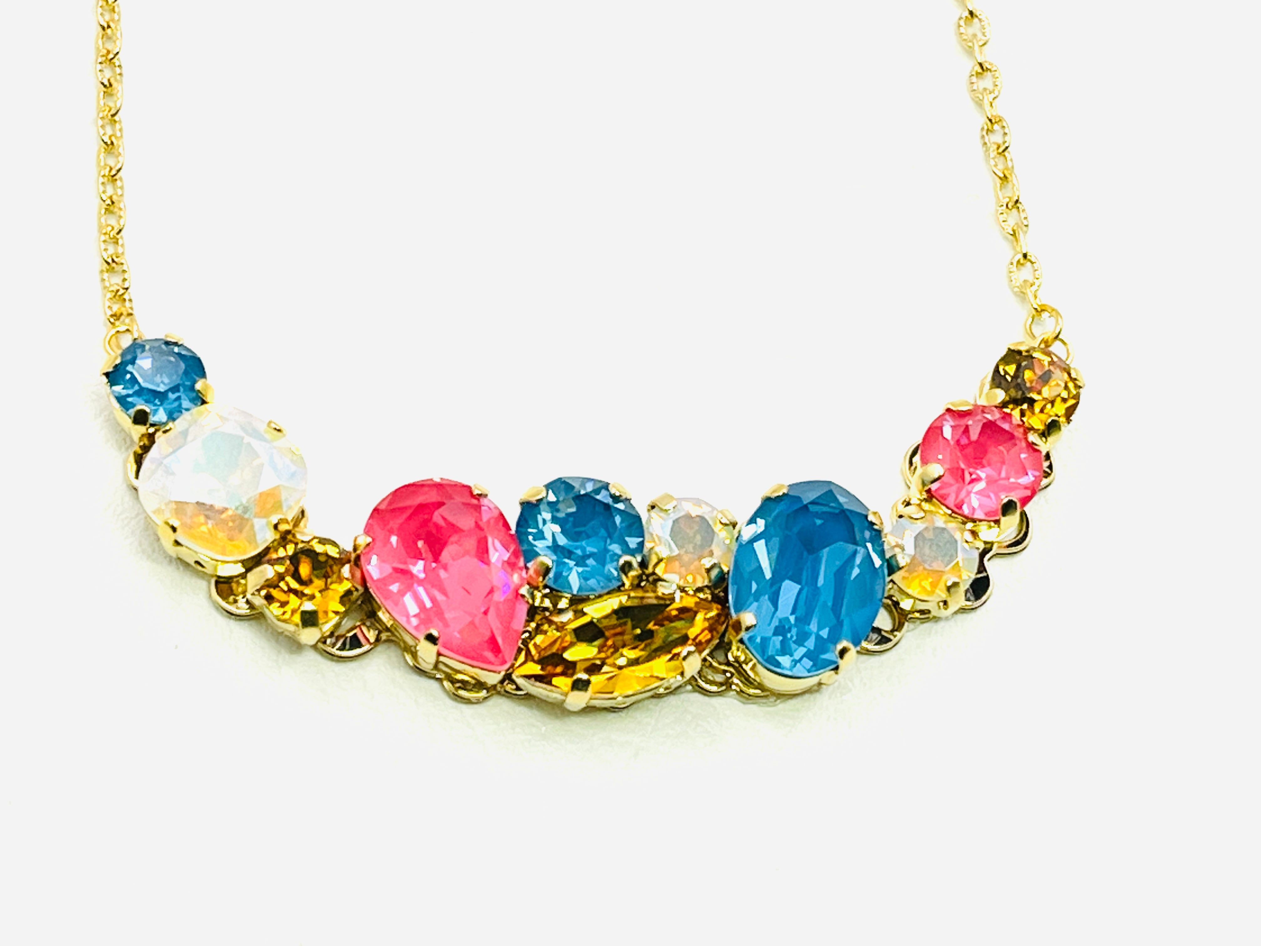 ヴィンテージに見られるクラスタータイプのアクセサリーをイメージして現代のお洋服にも合わせられるように意識しつつ、カラーテーマに沿ってグラスストーンを配置しています。