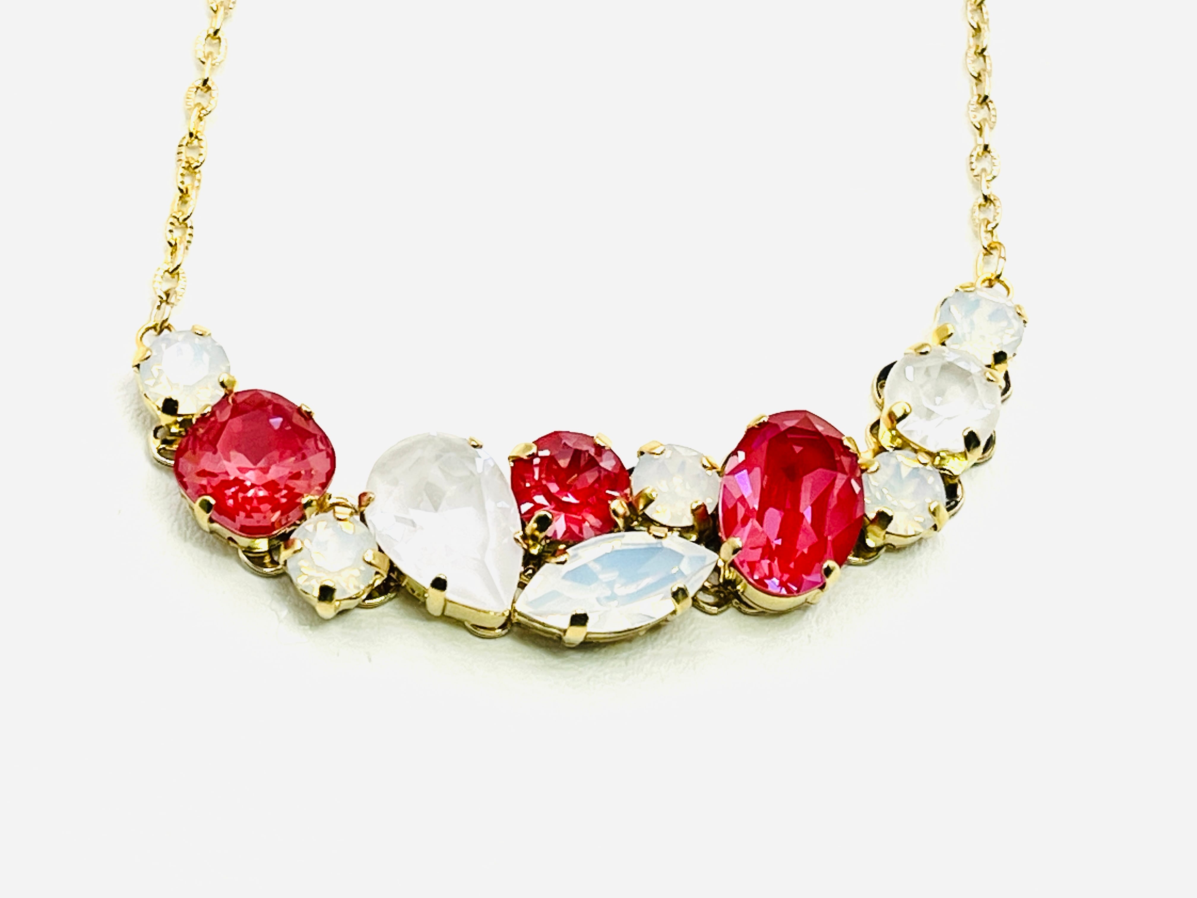 ヴィンテージに見られるクラスタータイプのアクセサリーをイメージして現代のお洋服にも合わせられるように意識しつつ、カラーテーマに沿ってグラスストーンを配置しています。