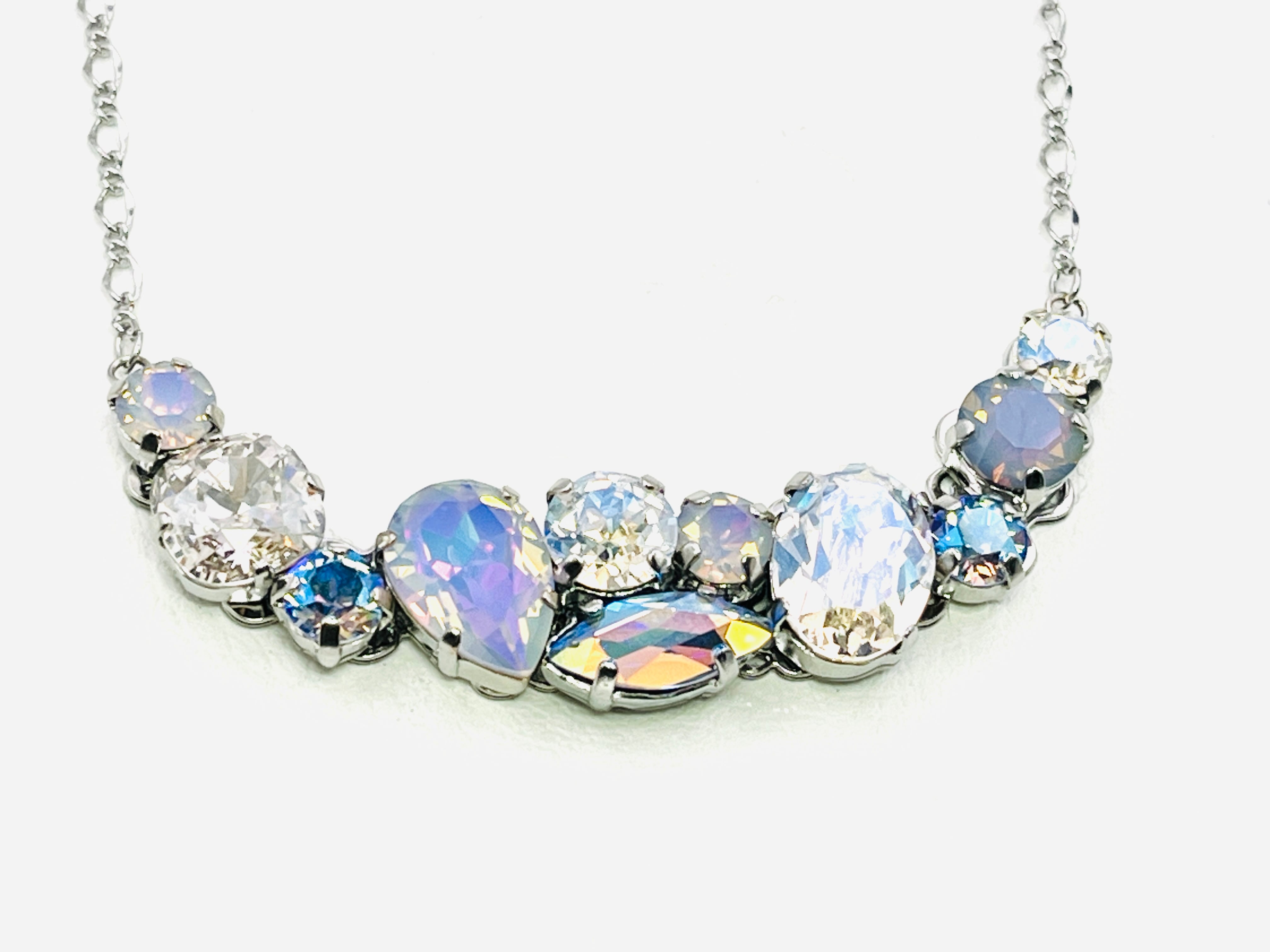 ヴィンテージに見られるクラスタータイプのアクセサリーをイメージして現代のお洋服にも合わせられるように意識しつつ、カラーテーマに沿ってグラスストーンを配置しています。