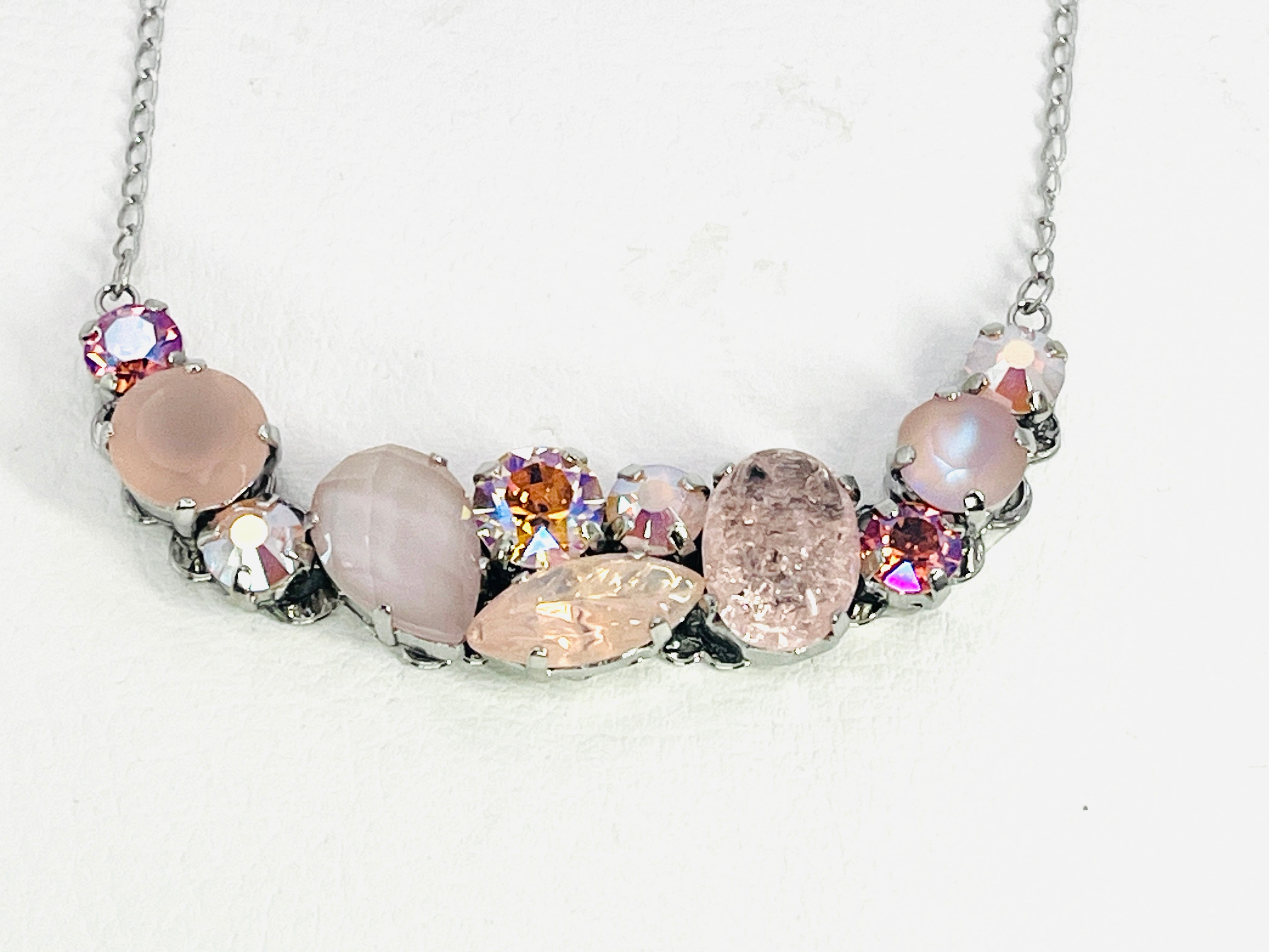 ヴィンテージに見られるクラスタータイプのアクセサリーをイメージして現代のお洋服にも合わせられるように意識しつつ、カラーテーマに沿ってグラスストーンを配置しています。