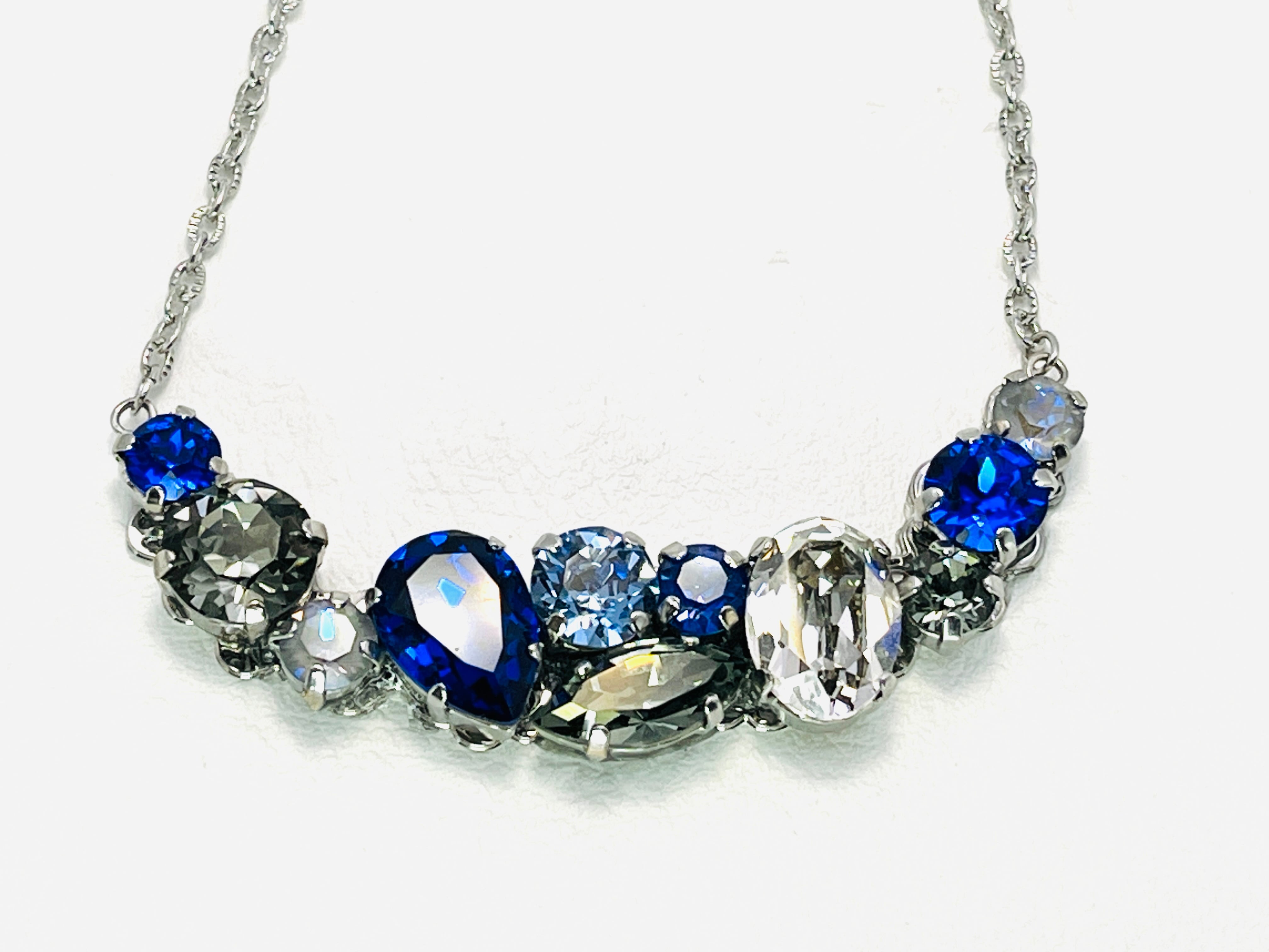 ヴィンテージに見られるクラスタータイプのアクセサリーをイメージして現代のお洋服にも合わせられるように意識しつつ、カラーテーマに沿ってグラスストーンを配置しています。