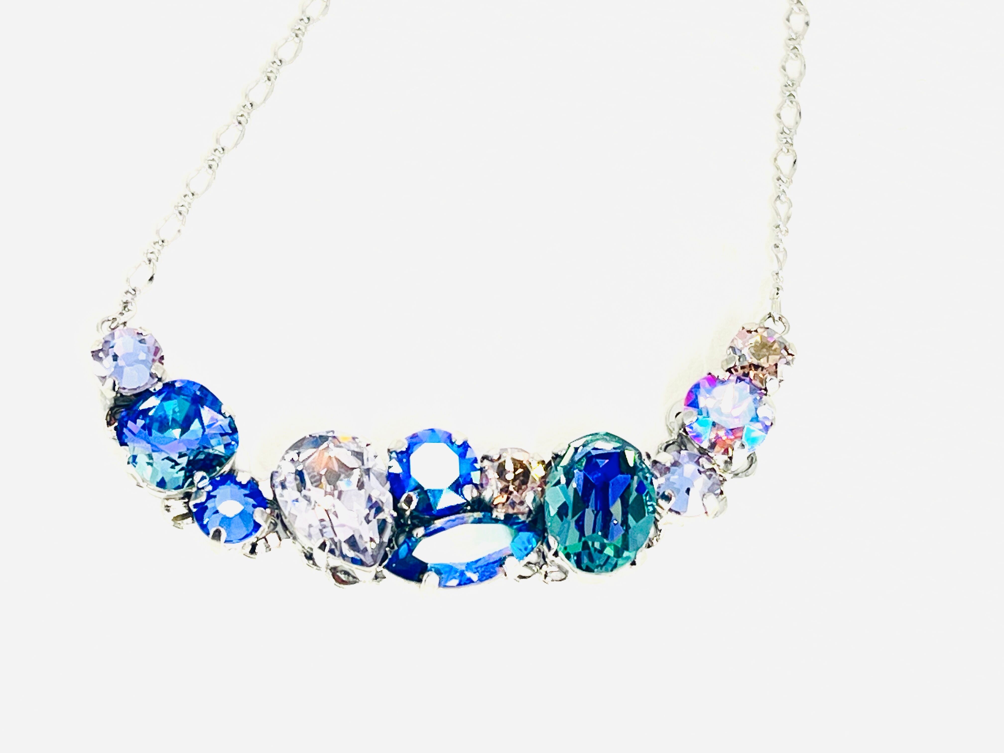 ヴィンテージに見られるクラスタータイプのアクセサリーをイメージして現代のお洋服にも合わせられるように意識しつつ、カラーテーマに沿ってグラスストーンを配置しています。