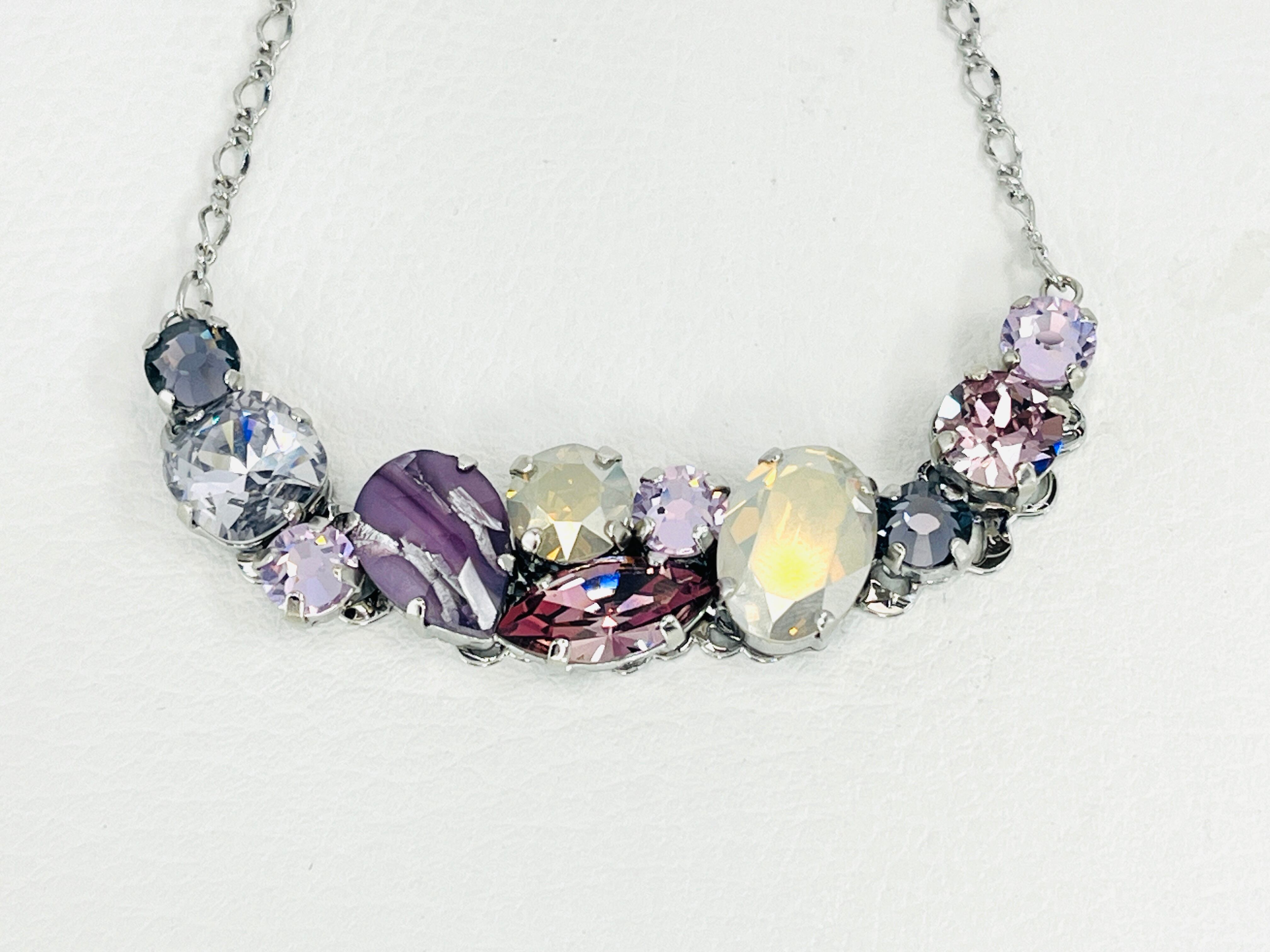ヴィンテージに見られるクラスタータイプのアクセサリーをイメージして現代のお洋服にも合わせられるように意識しつつ、カラーテーマに沿ってグラスストーンを配置しています。