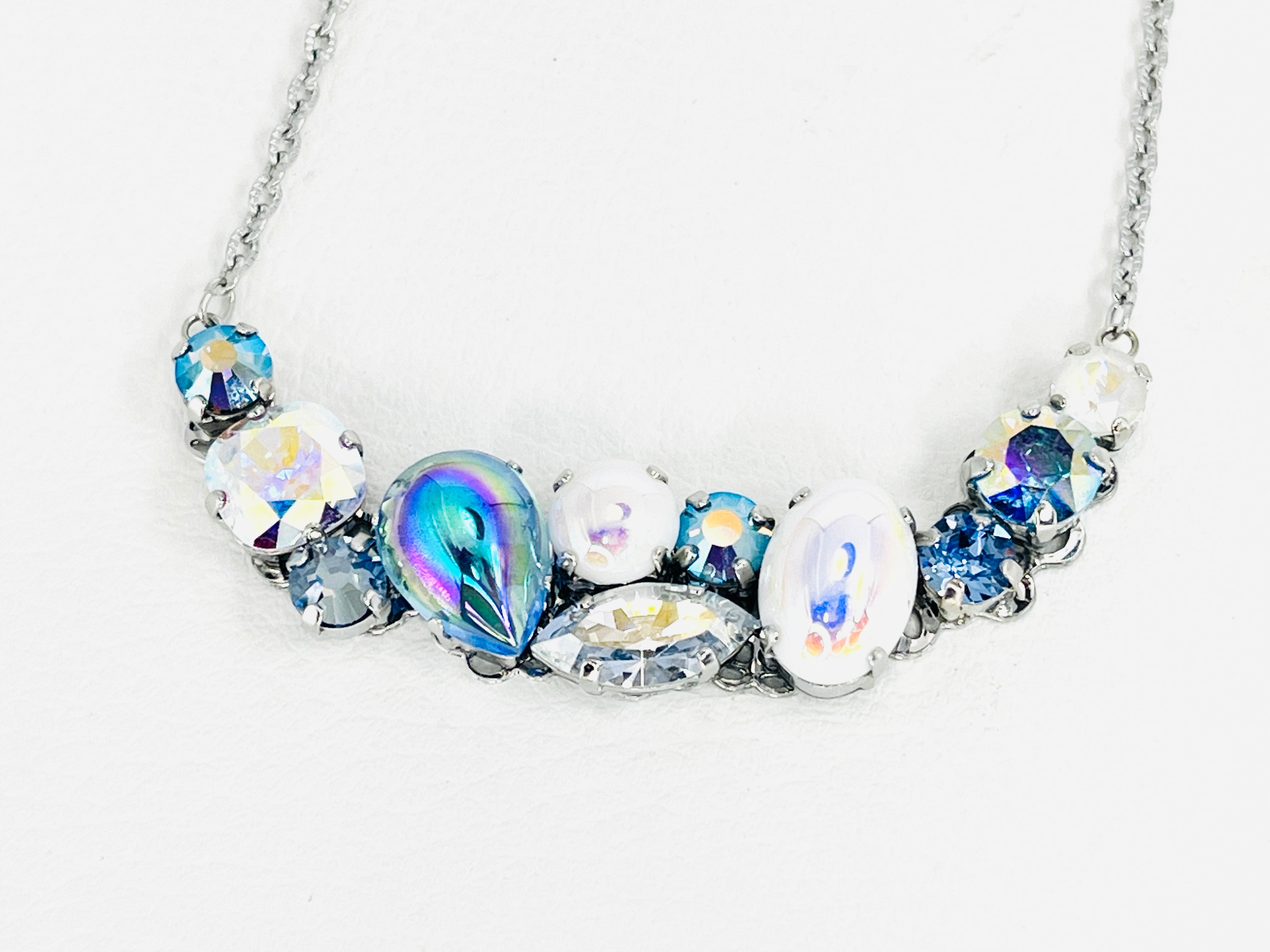 ヴィンテージに見られるクラスタータイプのアクセサリーをイメージして現代のお洋服にも合わせられるように意識しつつ、カラーテーマに沿ってグラスストーンを配置しています。