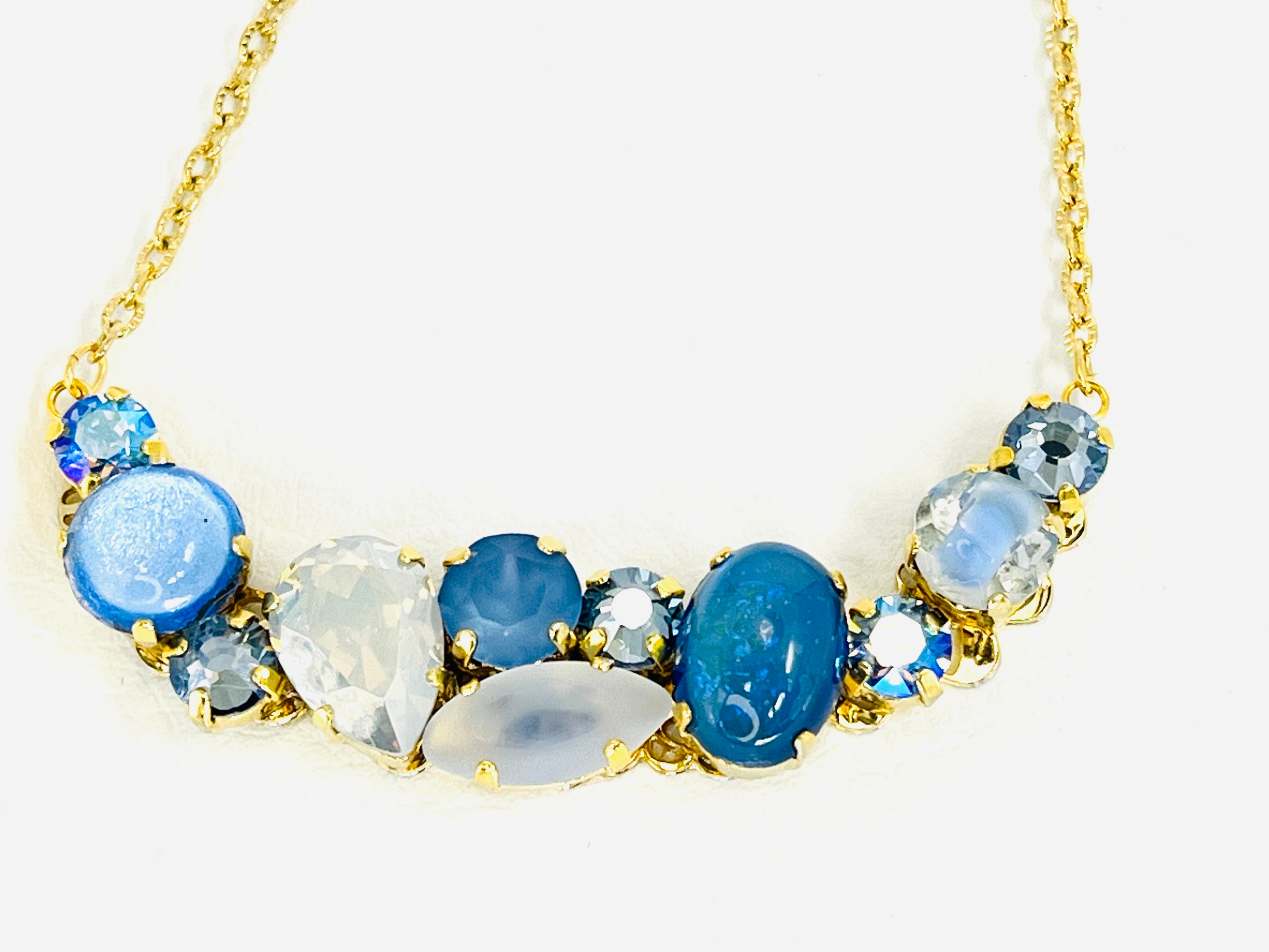 ヴィンテージに見られるクラスタータイプのアクセサリーをイメージして現代のお洋服にも合わせられるように意識しつつ、カラーテーマに沿ってグラスストーンを配置しています。