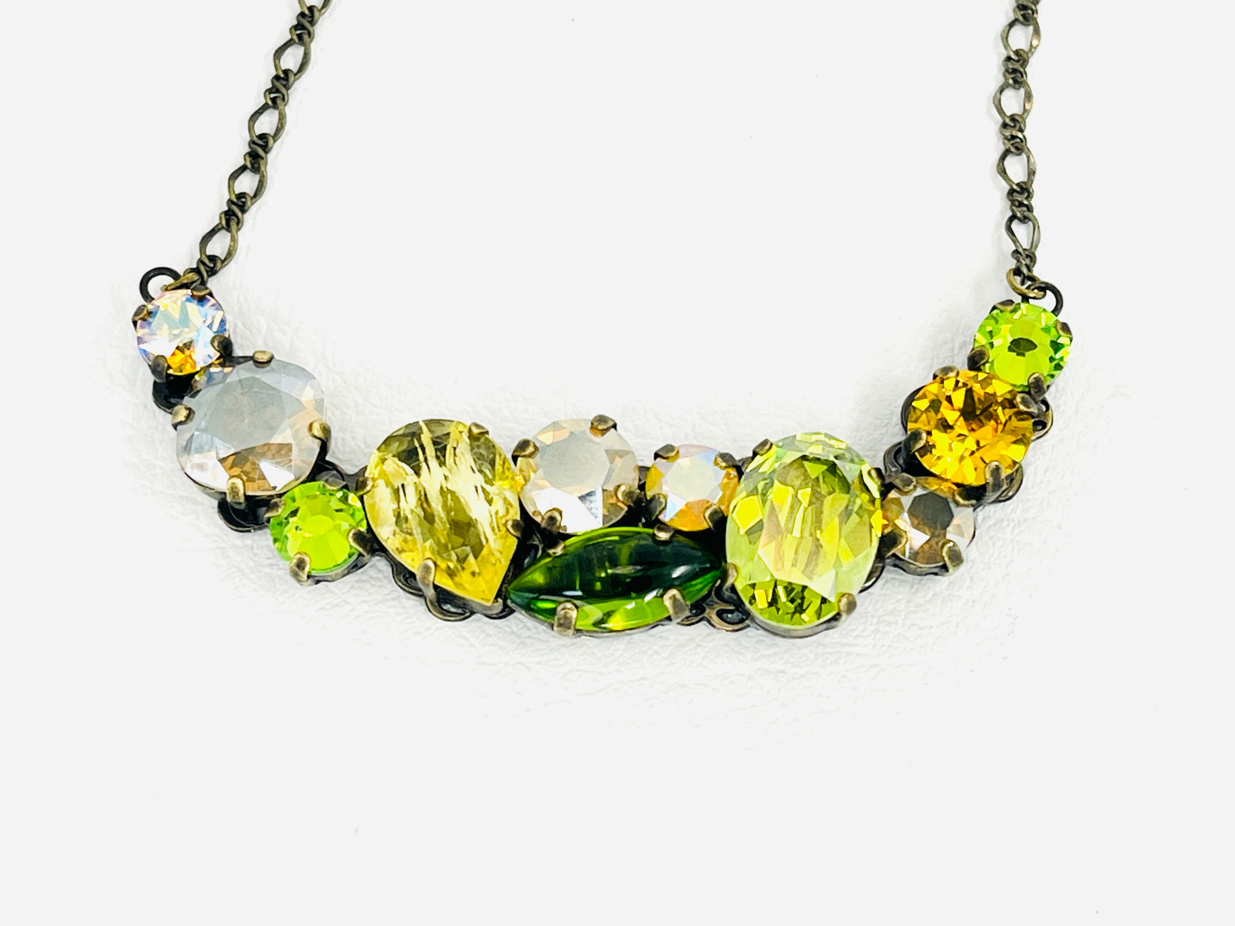 ヴィンテージに見られるクラスタータイプのアクセサリーをイメージして現代のお洋服にも合わせられるように意識しつつ、カラーテーマに沿ってグラスストーンを配置しています。