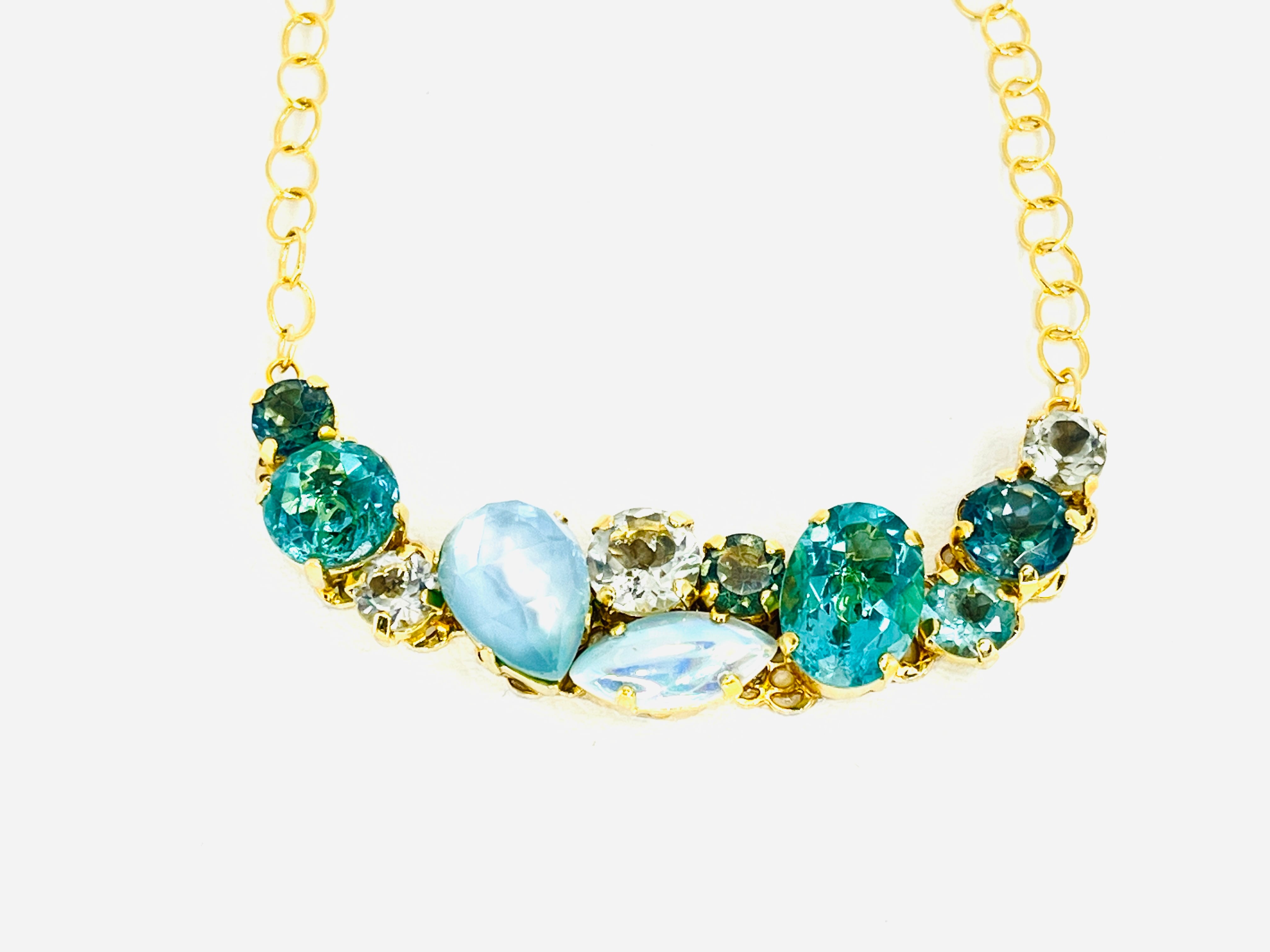 ヴィンテージに見られるクラスタータイプのアクセサリーをイメージして現代のお洋服にも合わせられるように意識しつつ、カラーテーマに沿ってグラスストーンを配置しています。