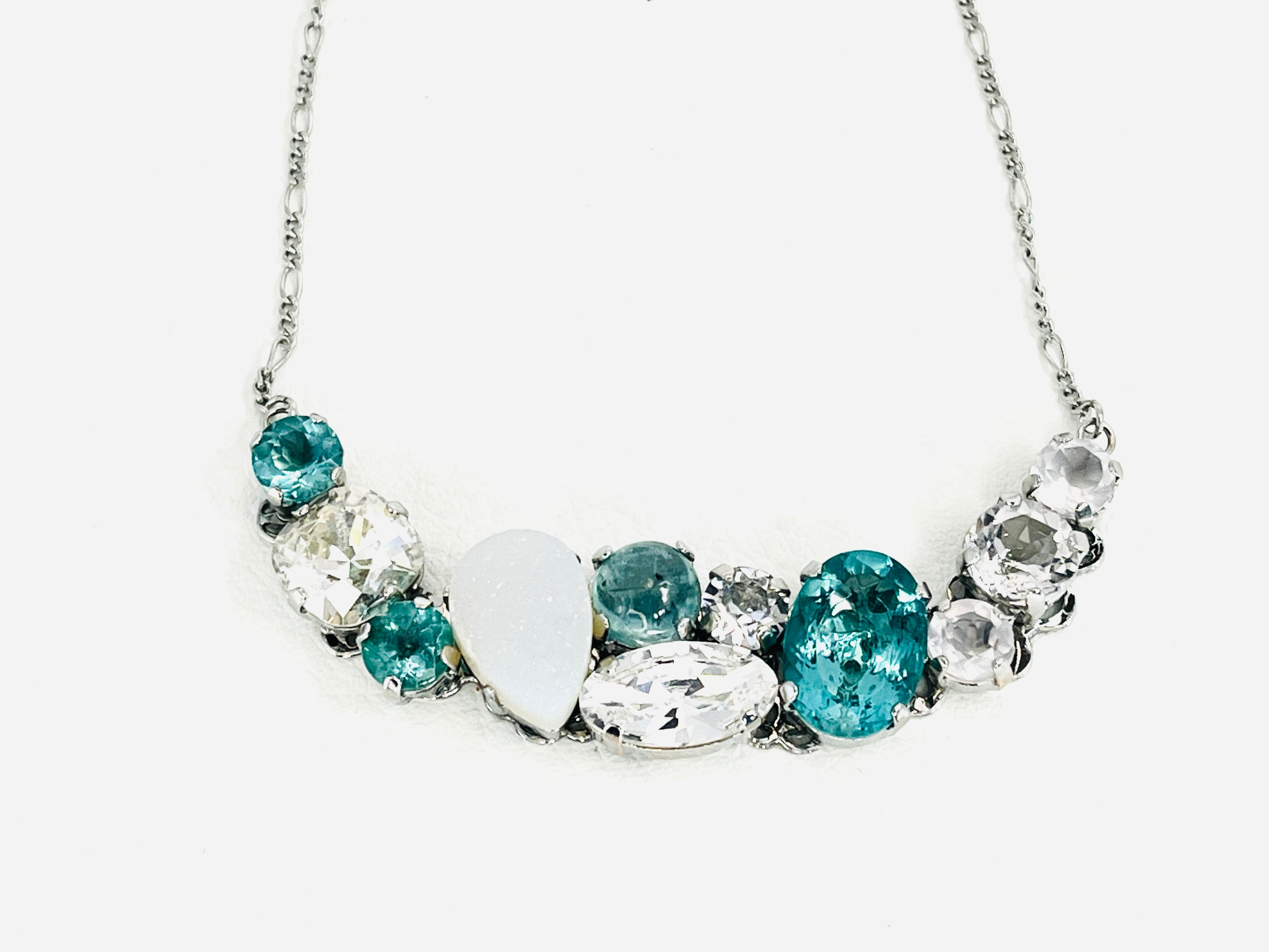 ヴィンテージに見られるクラスタータイプのアクセサリーをイメージして現代のお洋服にも合わせられるように意識しつつ、カラーテーマに沿ってグラスストーンを配置しています。