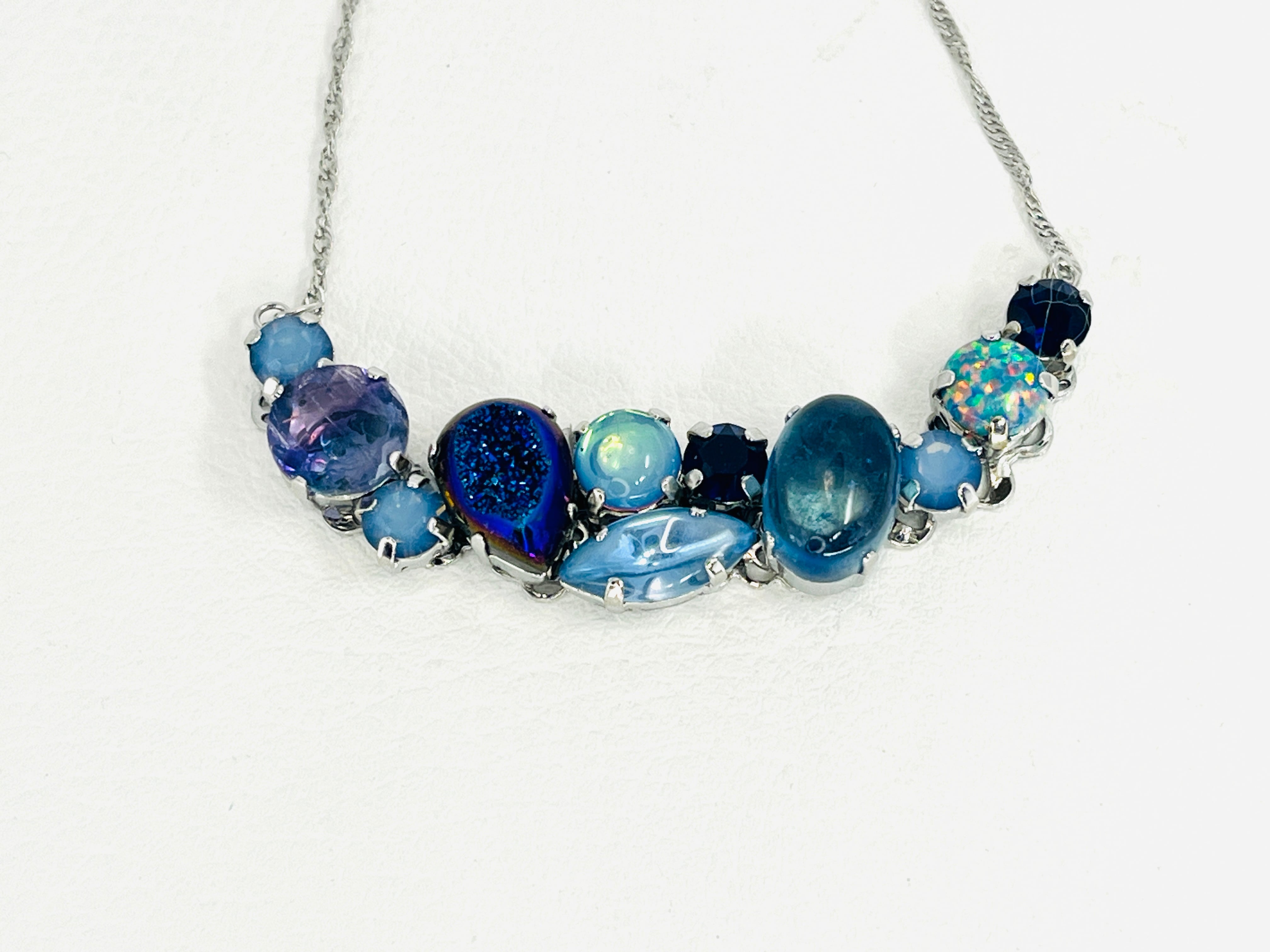 ヴィンテージに見られるクラスタータイプのアクセサリーをイメージして現代のお洋服にも合わせられるように意識しつつ、カラーテーマに沿ってグラスストーンを配置しています。