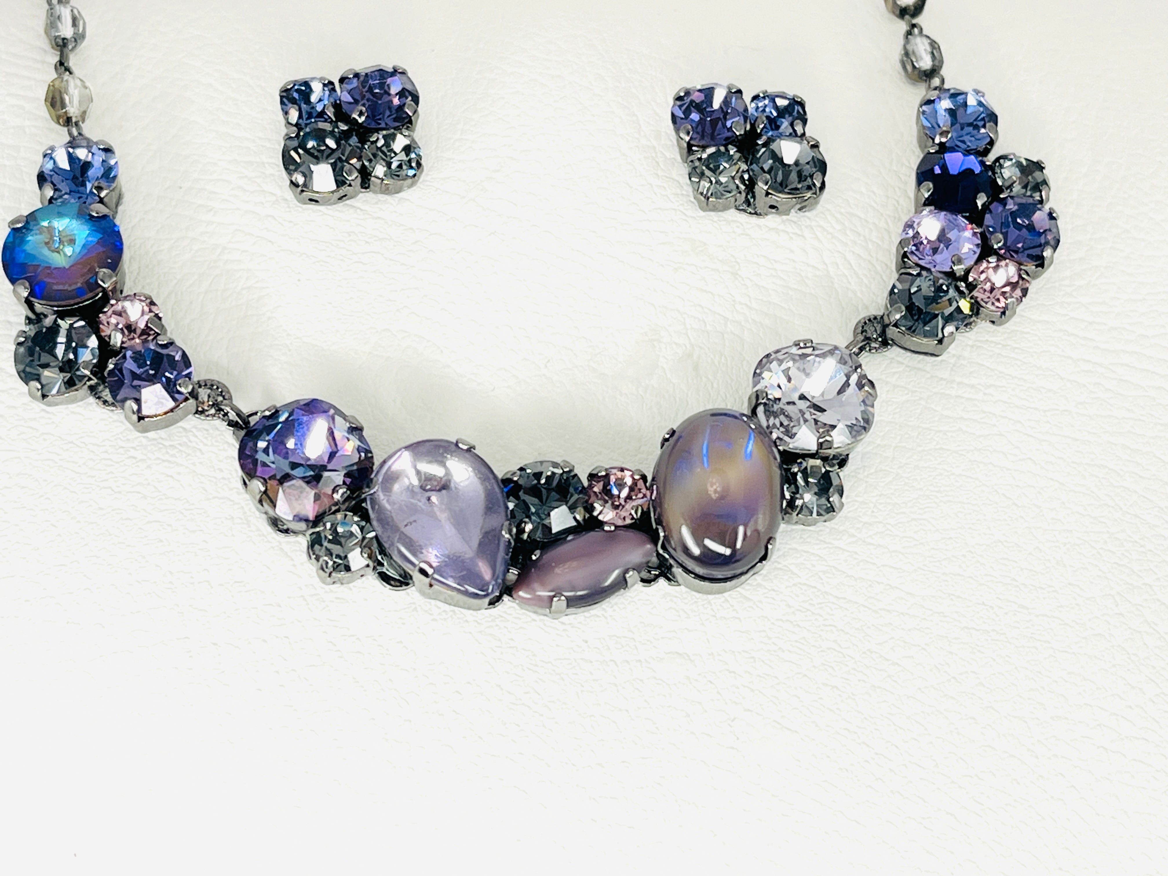 ヴィンテージに見られるクラスタータイプのアクセサリーをイメージして現代のお洋服にも合わせられるように意識しつつ、カラーテーマに沿ってグラスストーンを配置しています。