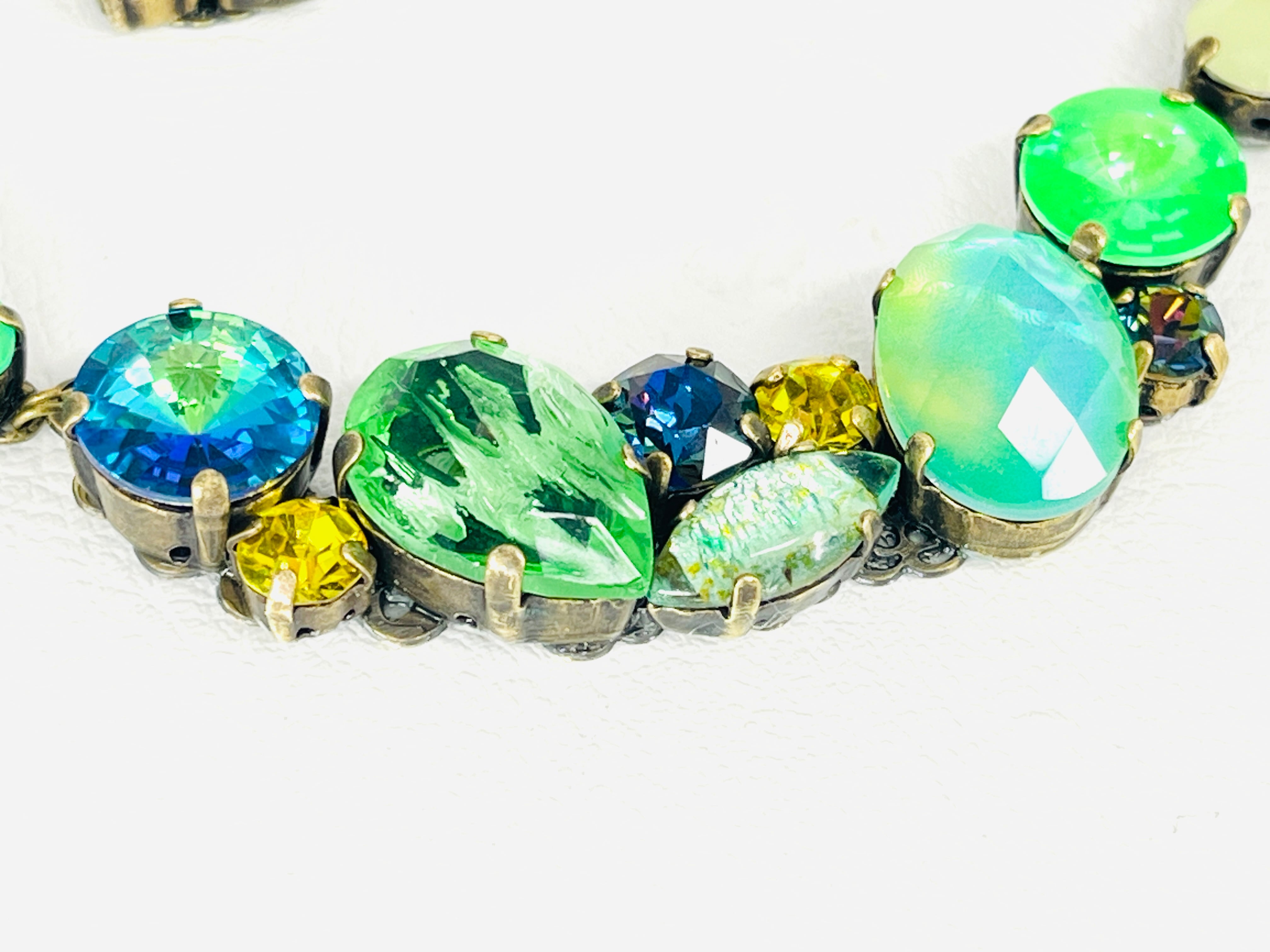 ヴィンテージに見られるクラスタータイプのアクセサリーをイメージして現代のお洋服にも合わせられるように意識しつつ、カラーテーマに沿ってグラスストーンを配置しています。