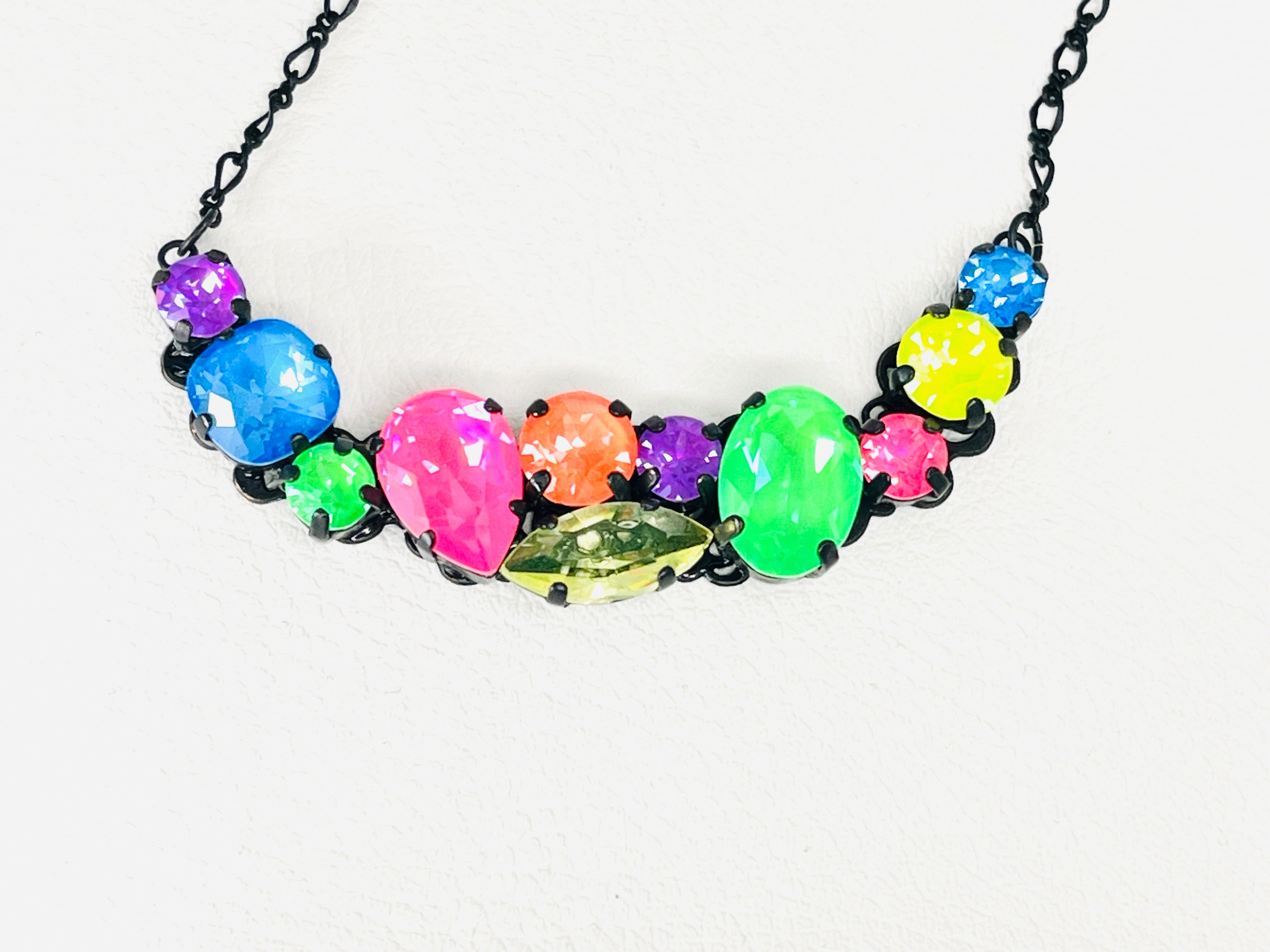 ヴィンテージに見られるクラスタータイプのアクセサリーをイメージして現代のお洋服にも合わせられるように意識しつつ、カラーテーマに沿ってグラスストーンを配置しています。