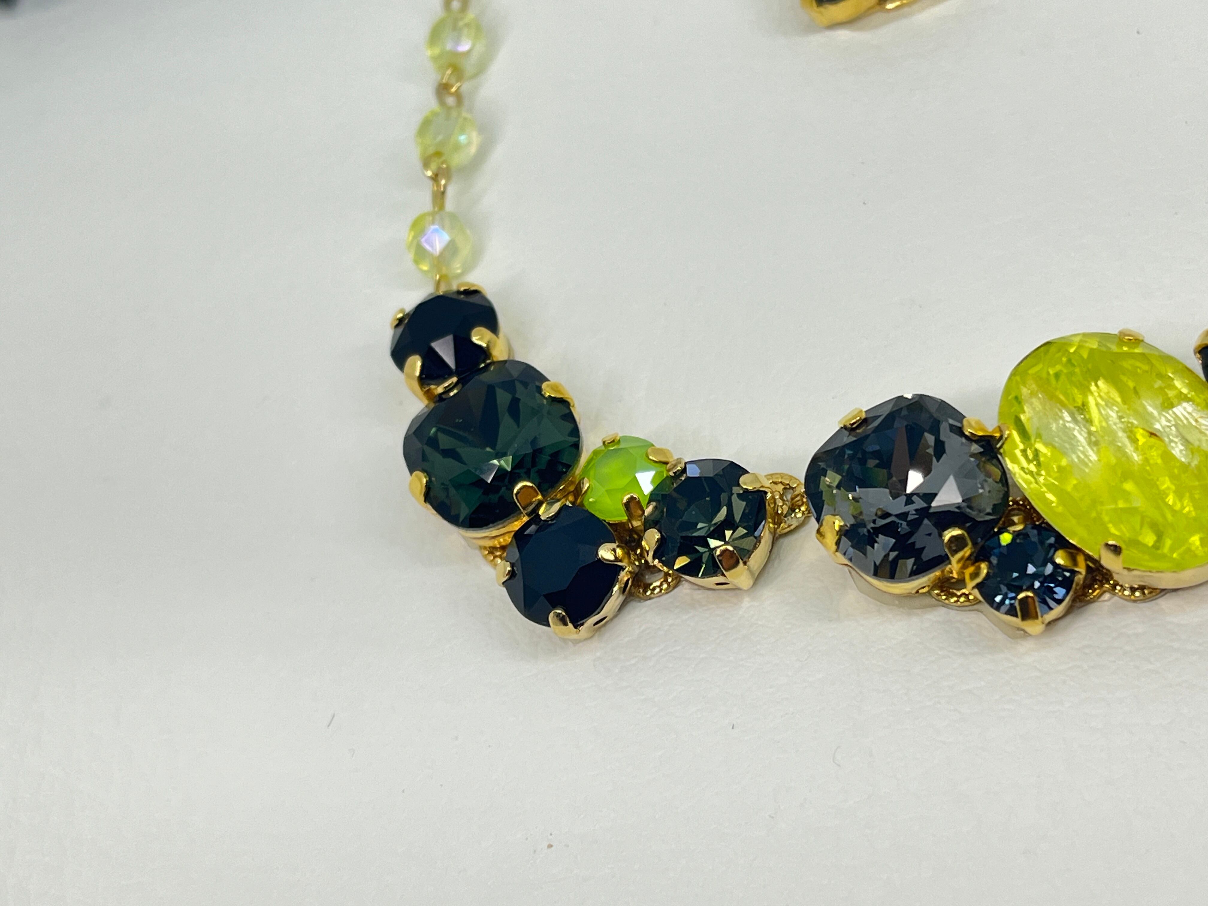 ヴィンテージに見られるクラスタータイプのアクセサリーをイメージして現代のお洋服にも合わせられるように意識しつつ、カラーテーマに沿ってグラスストーンを配置しています。