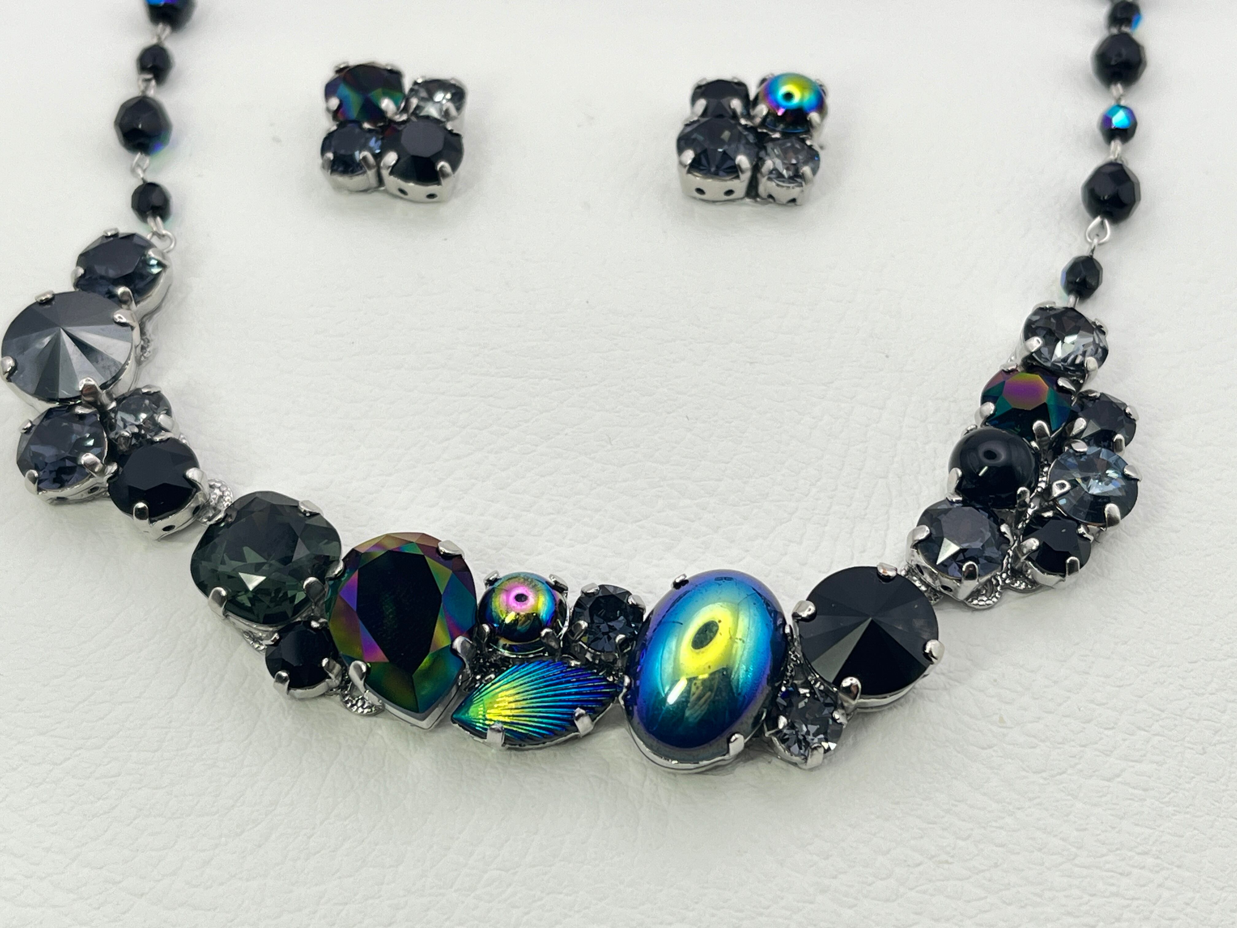 ヴィンテージに見られるクラスタータイプのアクセサリーをイメージして現代のお洋服にも合わせられるように意識しつつ、カラーテーマに沿ってグラスストーンを配置しています。