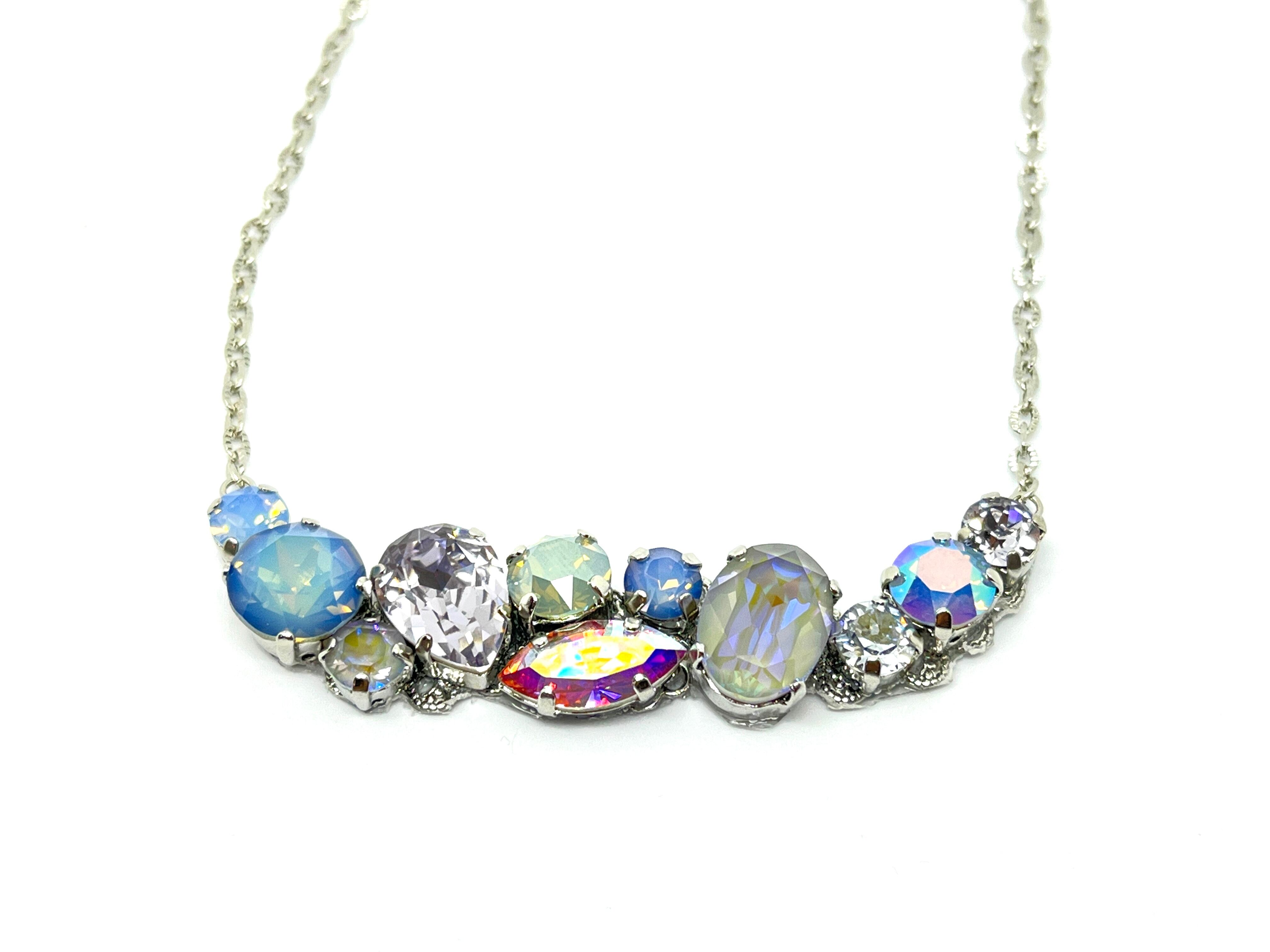ヴィンテージに見られるクラスタータイプのアクセサリーをイメージして現代のお洋服にも合わせられるように意識しつつ、カラーテーマに沿ってグラスストーンを配置しています。