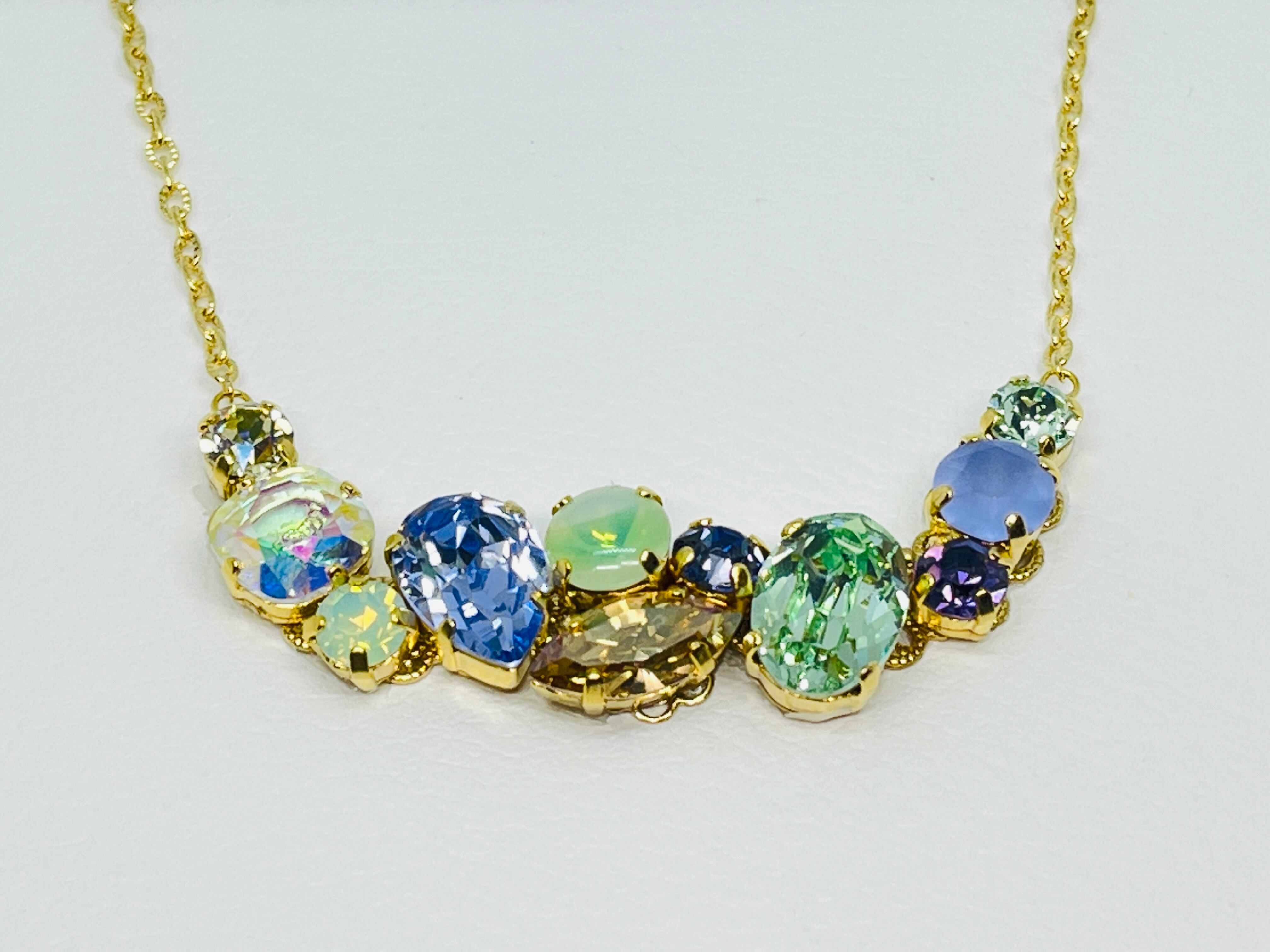 ヴィンテージに見られるクラスタータイプのアクセサリーをイメージして現代のお洋服にも合わせられるように意識しつつ、カラーテーマに沿ってグラスストーンを配置しています。