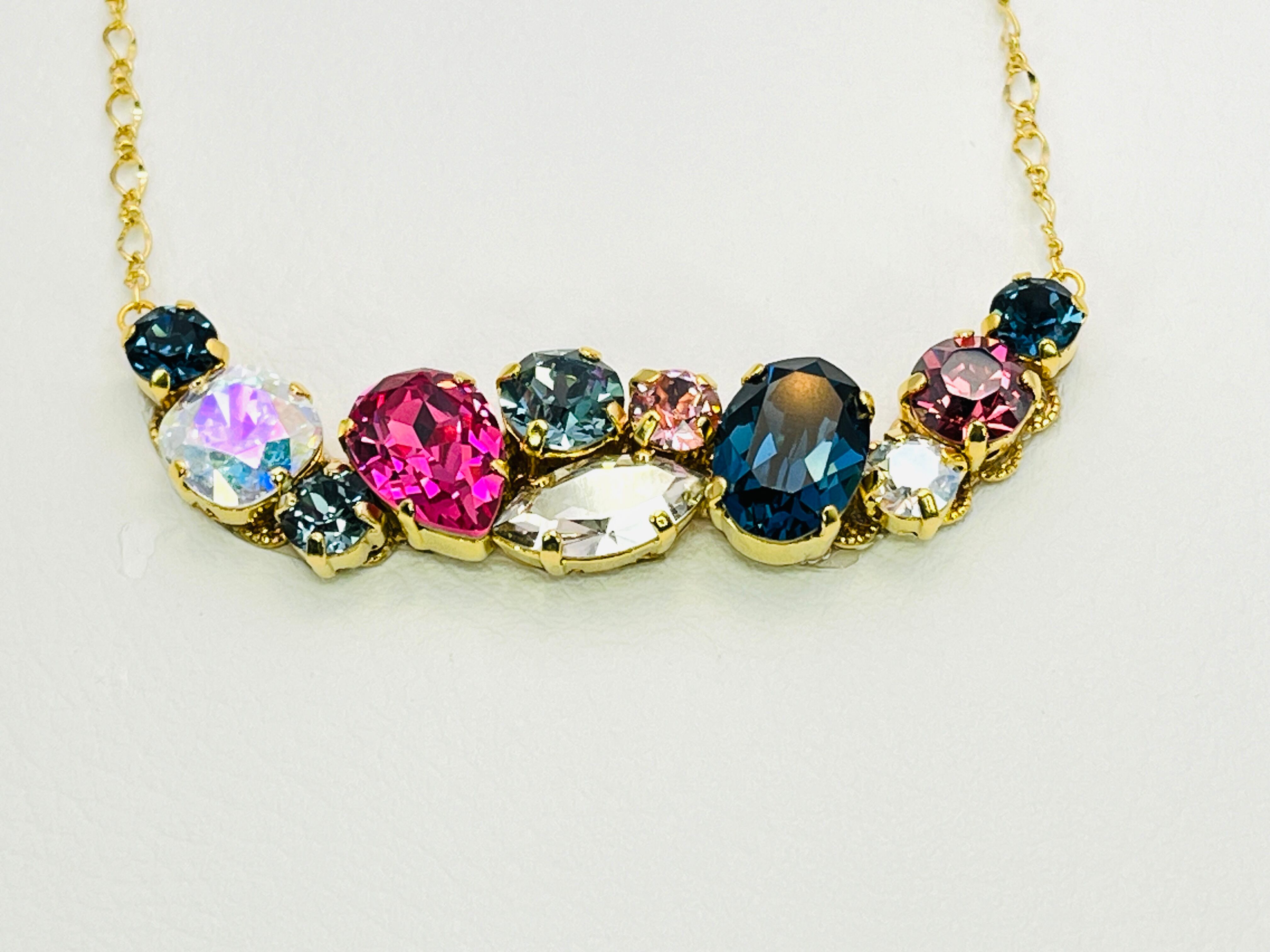ヴィンテージに見られるクラスタータイプのアクセサリーをイメージして現代のお洋服にも合わせられるように意識しつつ、カラーテーマに沿ってグラスストーンを配置しています。