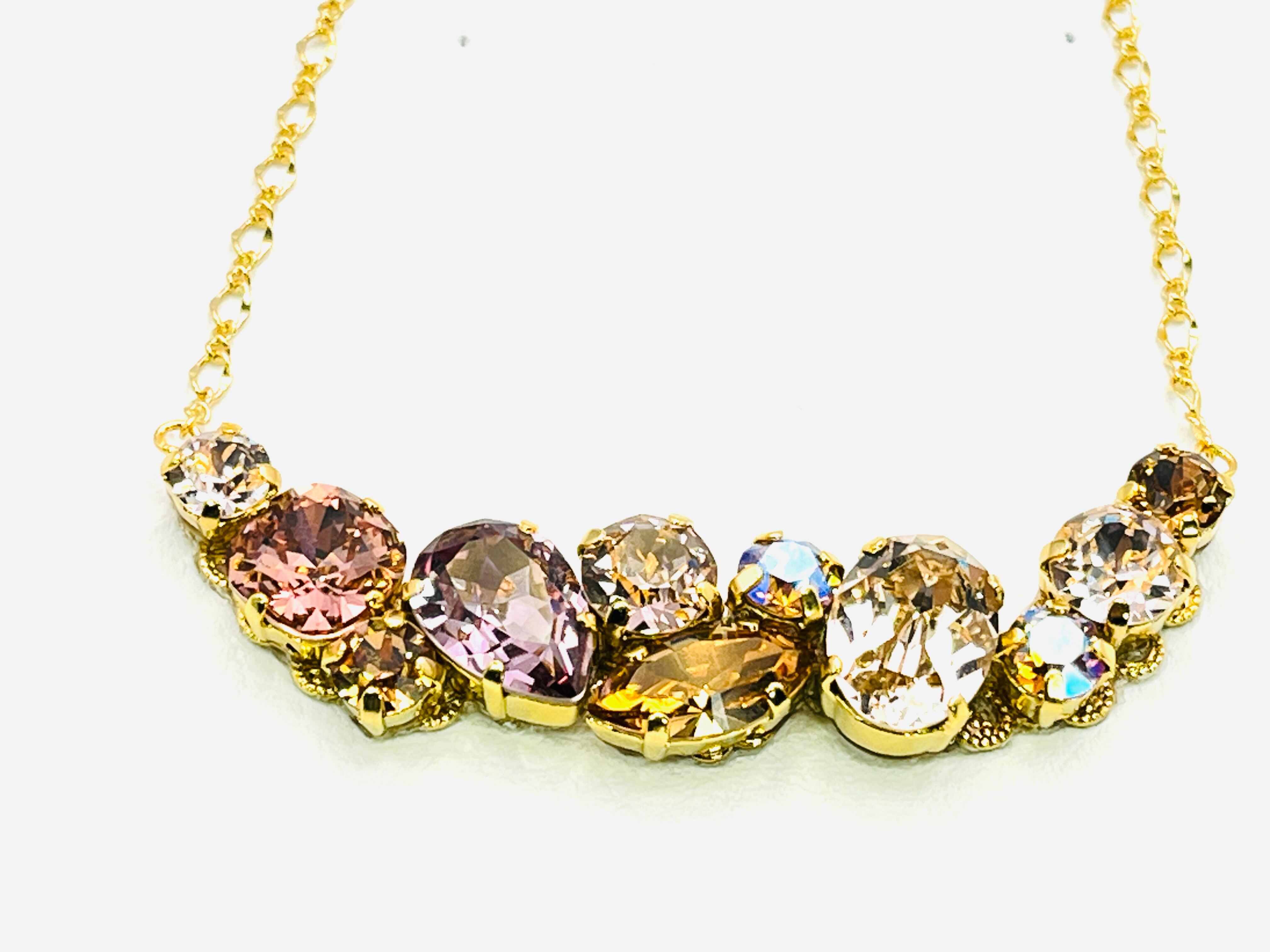 ヴィンテージに見られるクラスタータイプのアクセサリーをイメージして現代のお洋服にも合わせられるように意識しつつ、カラーテーマに沿ってグラスストーンを配置しています。