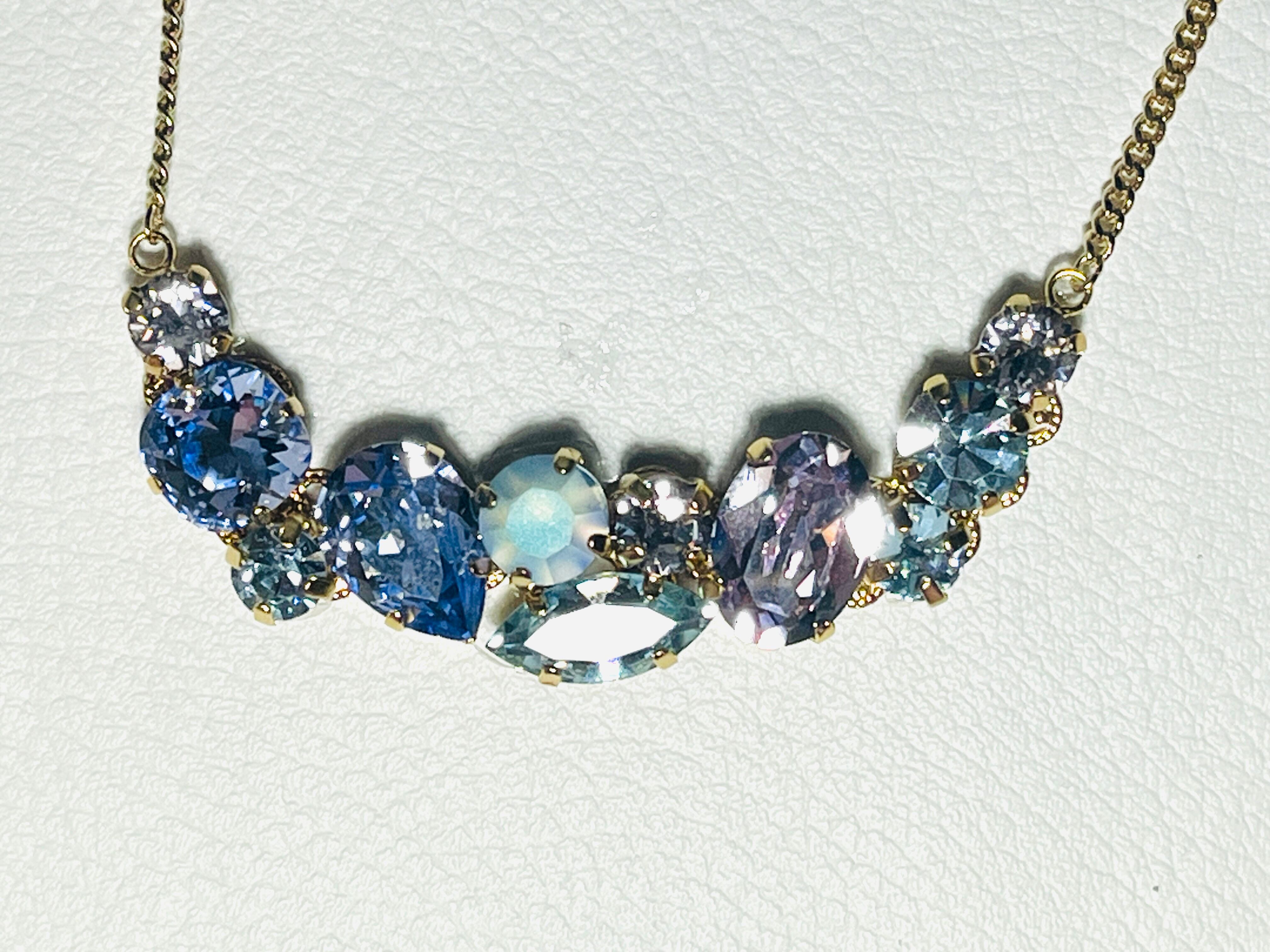 ヴィンテージに見られるクラスタータイプのアクセサリーをイメージして現代のお洋服にも合わせられるように意識しつつ、カラーテーマに沿ってグラスストーンを配置しています。