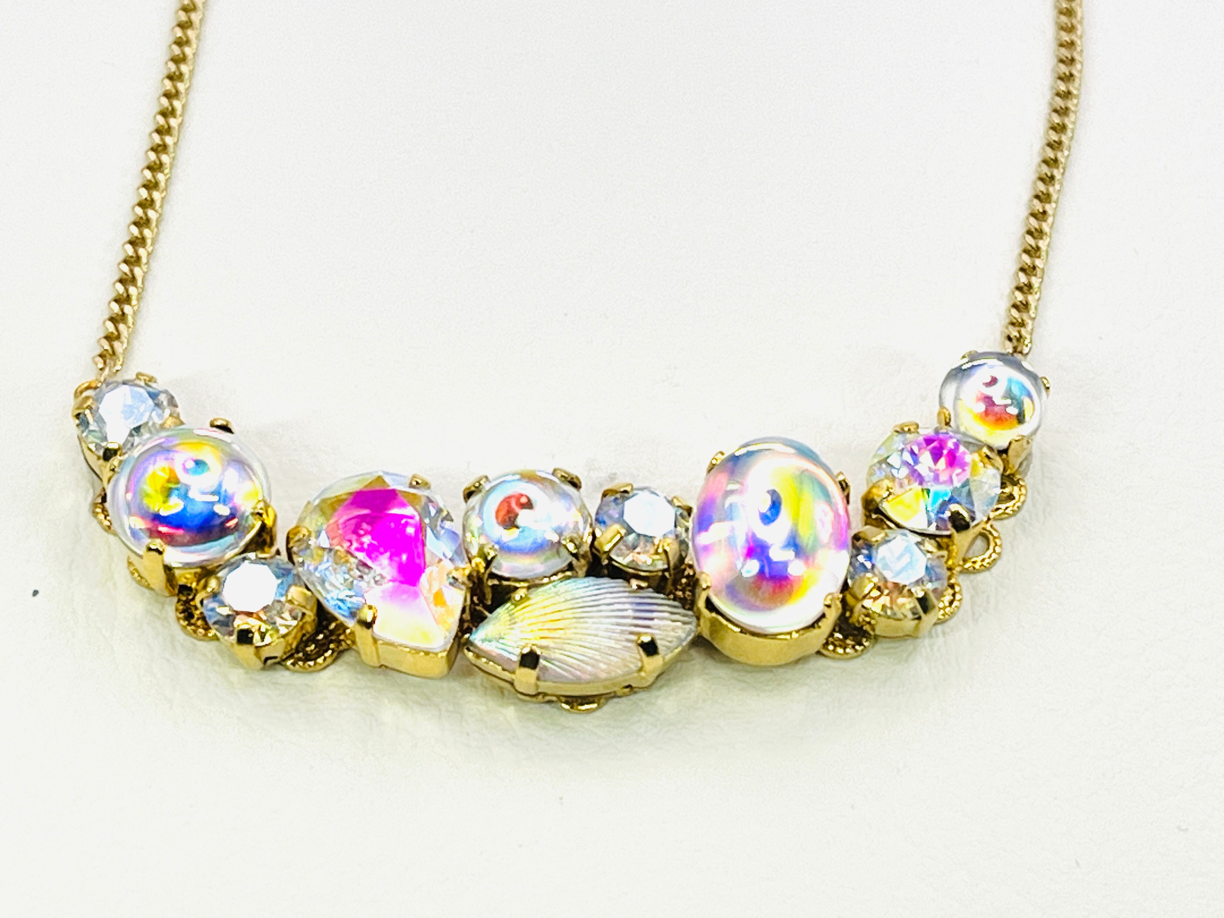 ヴィンテージに見られるクラスタータイプのアクセサリーをイメージして現代のお洋服にも合わせられるように意識しつつ、カラーテーマに沿ってグラスストーンを配置しています。