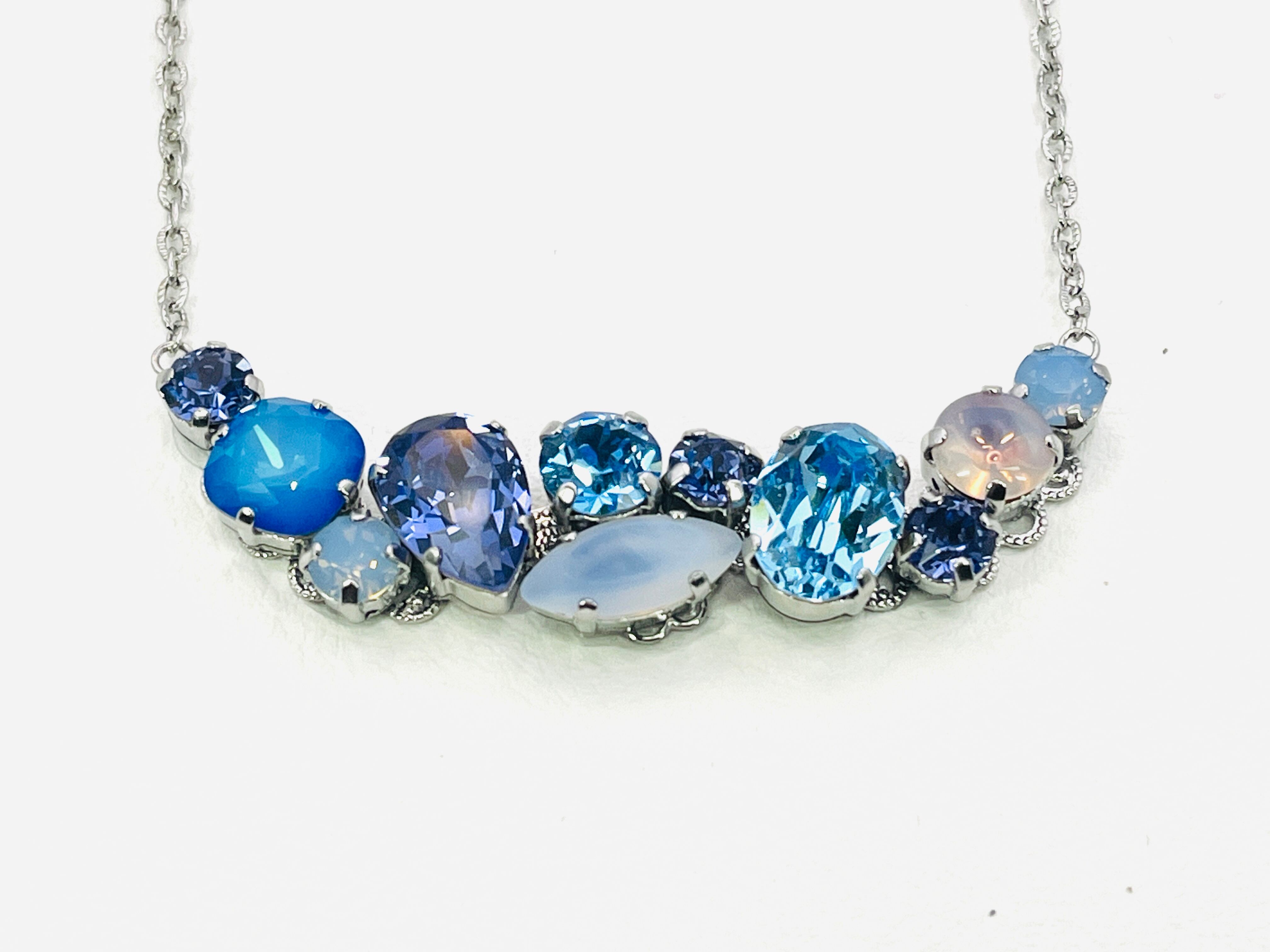ヴィンテージに見られるクラスタータイプのアクセサリーをイメージして現代のお洋服にも合わせられるように意識しつつ、カラーテーマに沿ってグラスストーンを配置しています。