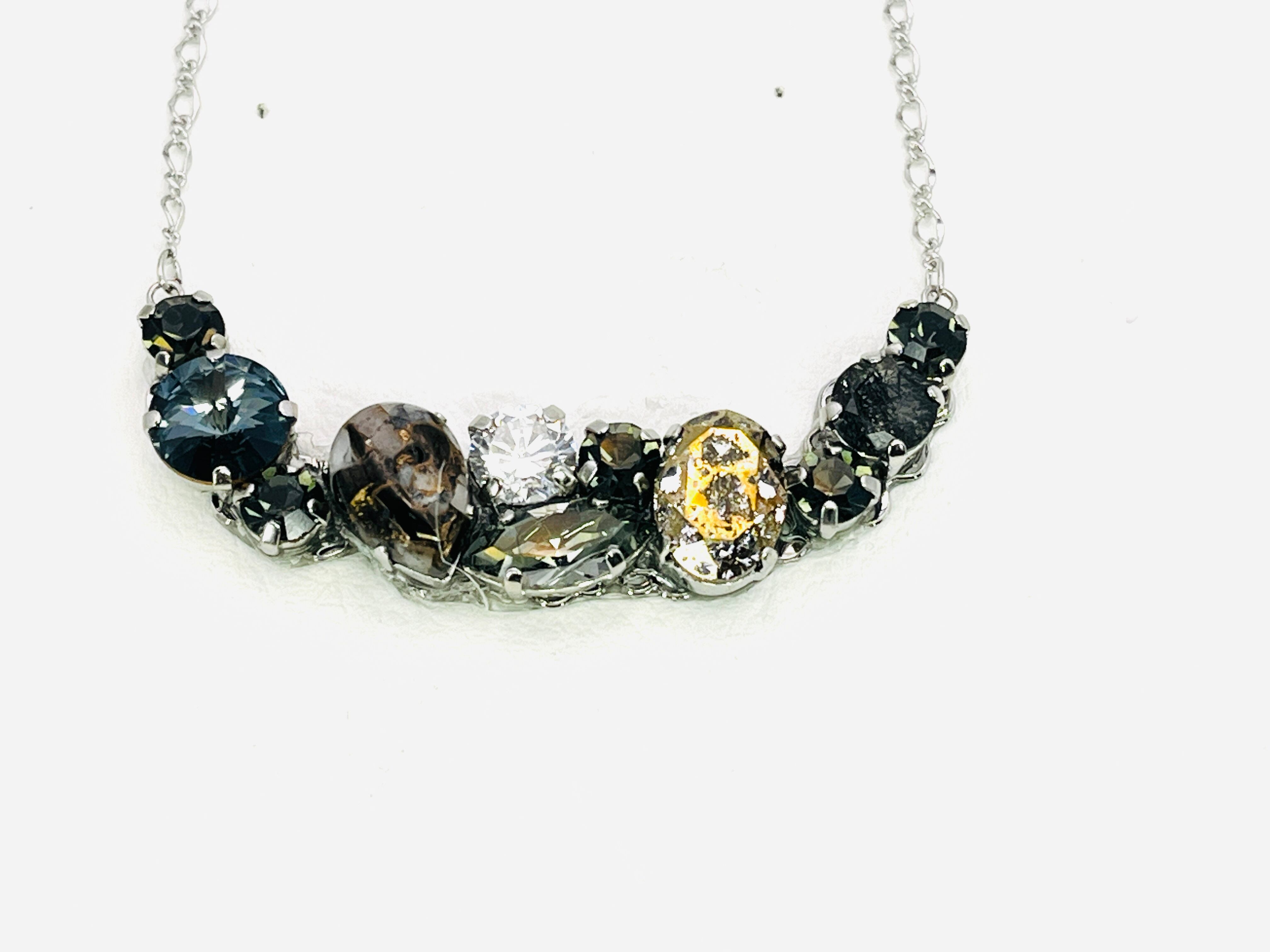 ヴィンテージに見られるクラスタータイプのアクセサリーをイメージして現代のお洋服にも合わせられるように意識しつつ、カラーテーマに沿ってグラスストーンを配置しています。